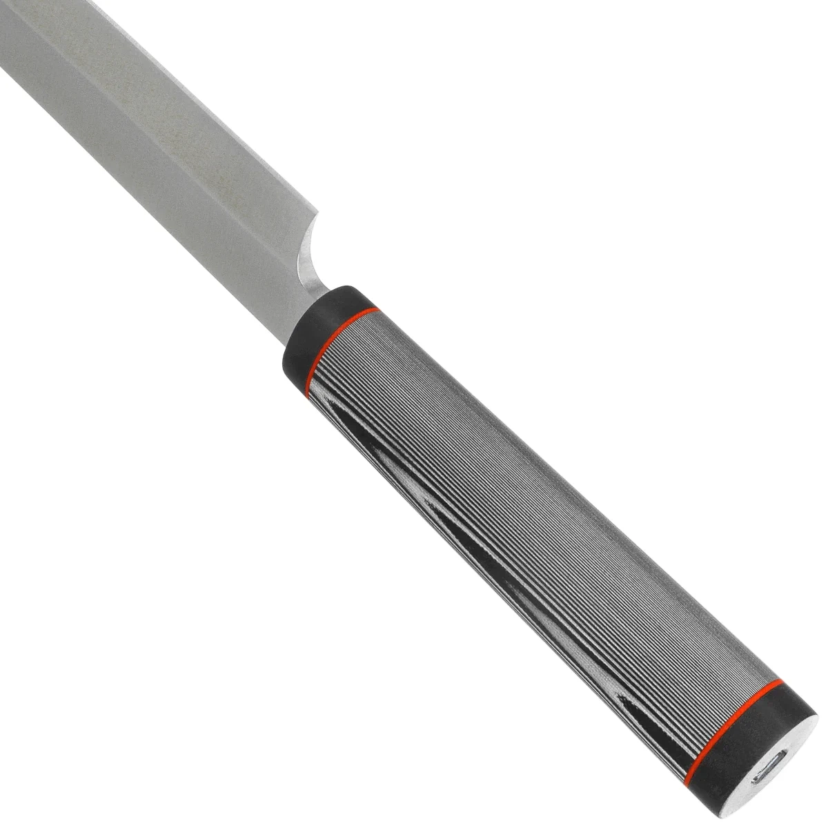 Blade- made of corrosion-resistant 5Cr15MoV stainless steel , which provides edge durability and ease of sharpening - especially important for everyday kitchen use. The Yanagiba profile with a long, single-sided ground edge allows the blade to conduct a smooth cut along its entire length, which is crucial when filleting and preparing raw fish dishes. The satin finish reduces food sticking to the blade during slicing and hides minor scratches created during use, maintaining an elegant appearance even after long use. The flat grind allows the blade to precisely guide through delicate structures, minimizing damage and ensuring a smooth cutting line.