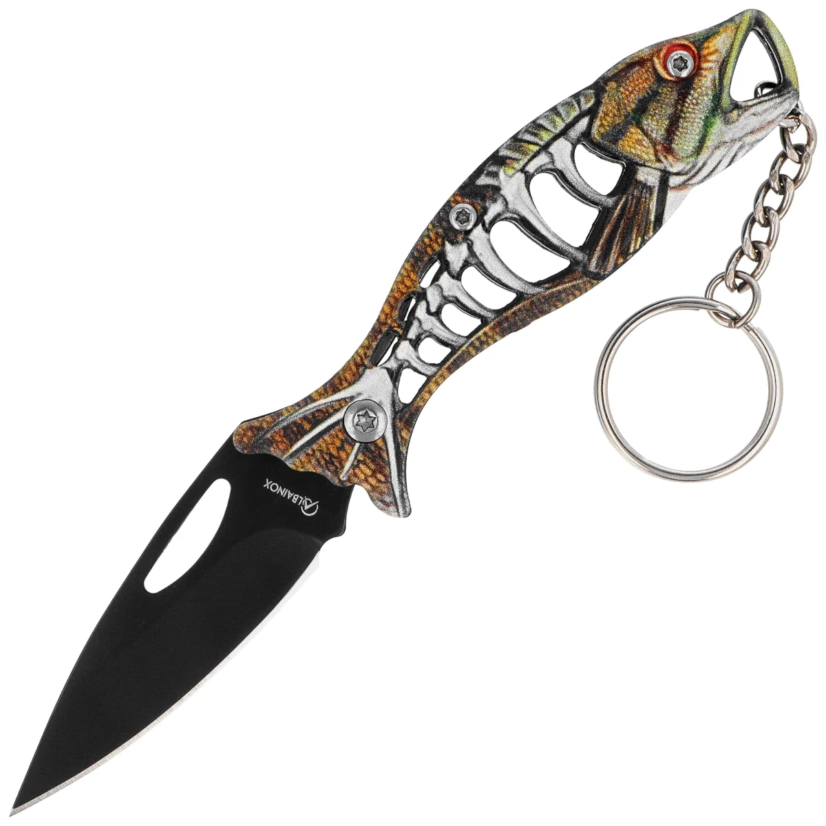 Golden Aluminum, Black 3Cr13MoV (18504-GD) is a small folding knife designed by Martinez Albainox as a lightweight and decorative folder for auxiliary use in aquatic and off-road environments. This model is distinguished by an aluminum Handle stylized in the silhouette of a fish, which emphasizes its fishing character and makes it easy to grip, even in wet conditions. Blade made of blackened 3Cr13MoV stainless steel offers corrosion resistance and ease of maintenance - ideal for simple tasks such as cutting line, preparing bait or minor repairs. Locks with the proven liner lock mechanism . Thanks to its compact size, ring on the chain, the knife can be clipped to your keys or bag, providing quick access whenever you need it. The overall design is functional, lightweight and aesthetically pleasing , making it an apt choice for anglers, collectors and active people looking for a useful tool with an unconventional look.