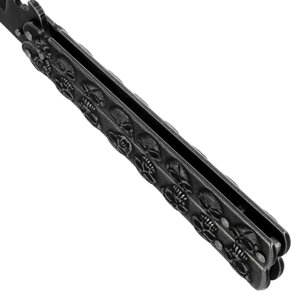 - Skull Gray Steel, Stonewashed – a decorative balisong butterfly knife from Martinez Albainox, made entirely of stainless steel. The skull motif, symmetrical shape, and stonewashed finish give it a distinctive character.