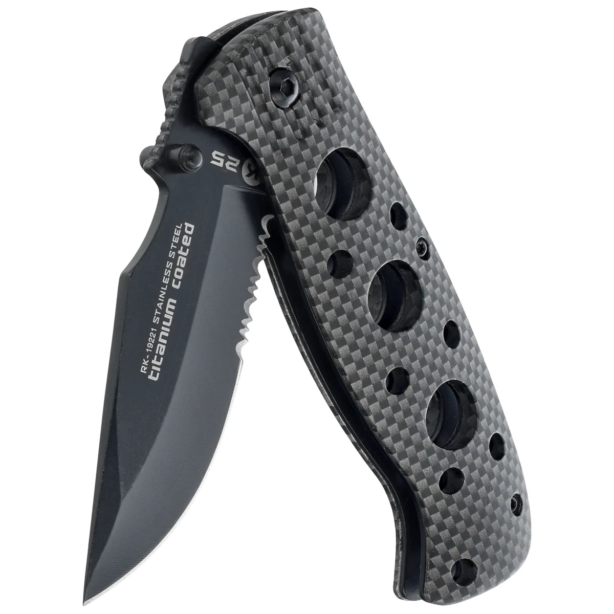 - RK-19221 Rubbered Black Aluminum, Black Titanium - folding EDC tactical knife by K25 with black titanium coated drop point blade and rubbered aluminum handle. Compact design with liner lock, clip and nylon sheath.