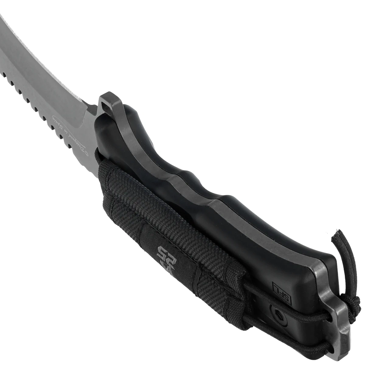 Handle - made of SFL plastic is designed for full control of the machete, even in adverse weather conditions. The textured surface and contoured finger recesses improve grip, reducing the risk of the tool slipping during dynamic movements. The overall design is resistant to impact, temperature extremes and moisture. A hole at the end of the grip allows attachment of a safety line. The set includes a ballistic nylon sheath with MOLLE attachment , allowing the machete to be carried at the belt, backpack or other equipment. This solution meets the needs of users looking for a heavier tool with high operational efficiency and durability.