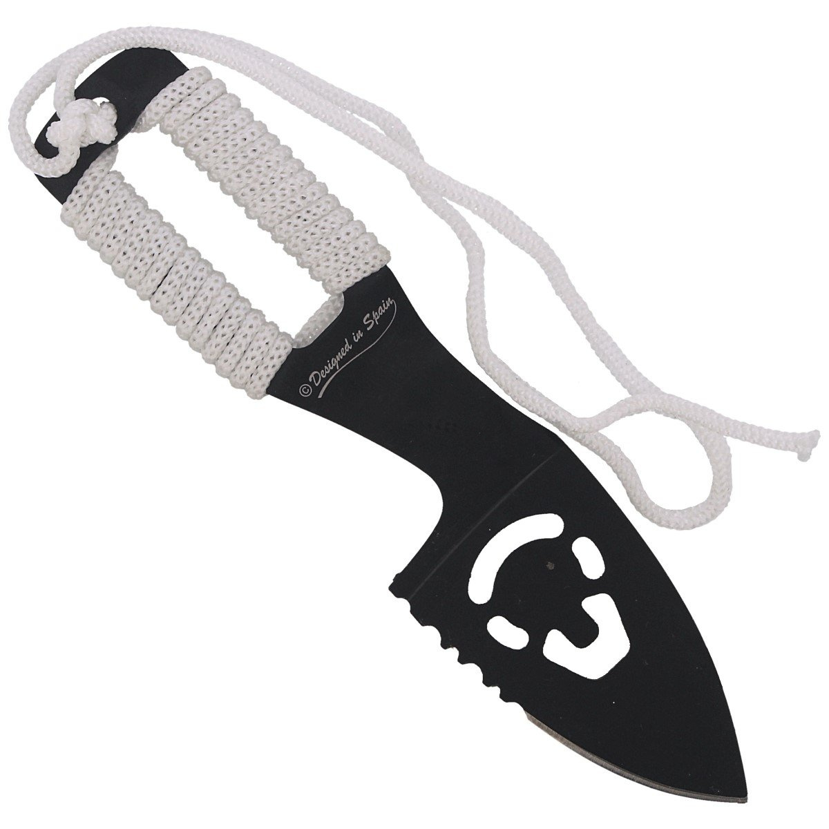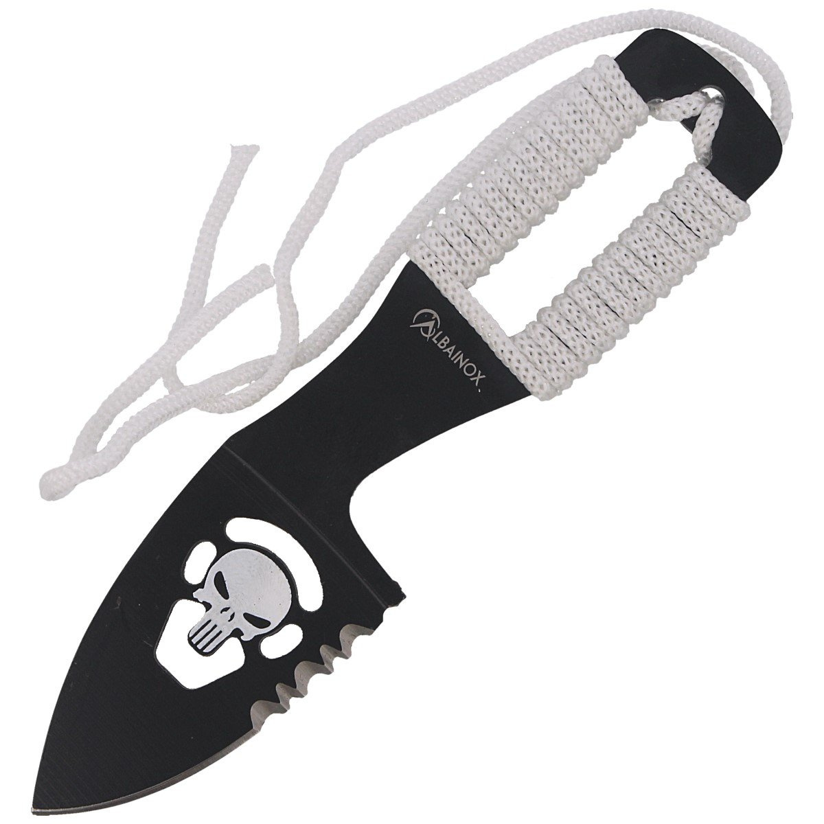 - Skull Neck Knife White Cord, Black - a compact neck knife with a spear point blade made of 3Cr13MoV steel, with a black protective coating and a Handle wrapped in white paracord. Designed for EDC and tactical applications.
