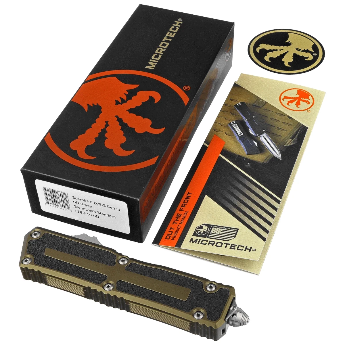 Scarab II Gen III D/E-S OD Green Aluminum/3M, Stonewashed is the pinnacle of excellence in automatic tactical knives, taking inspiration from the original Microtech Ultratech design. Built to withstand the toughest conditions, the new Scarab II is the ultimate choice for heavy use. While retaining the styling features of its predecessor, it sets a new standard for OTF (Out The Front) technology.