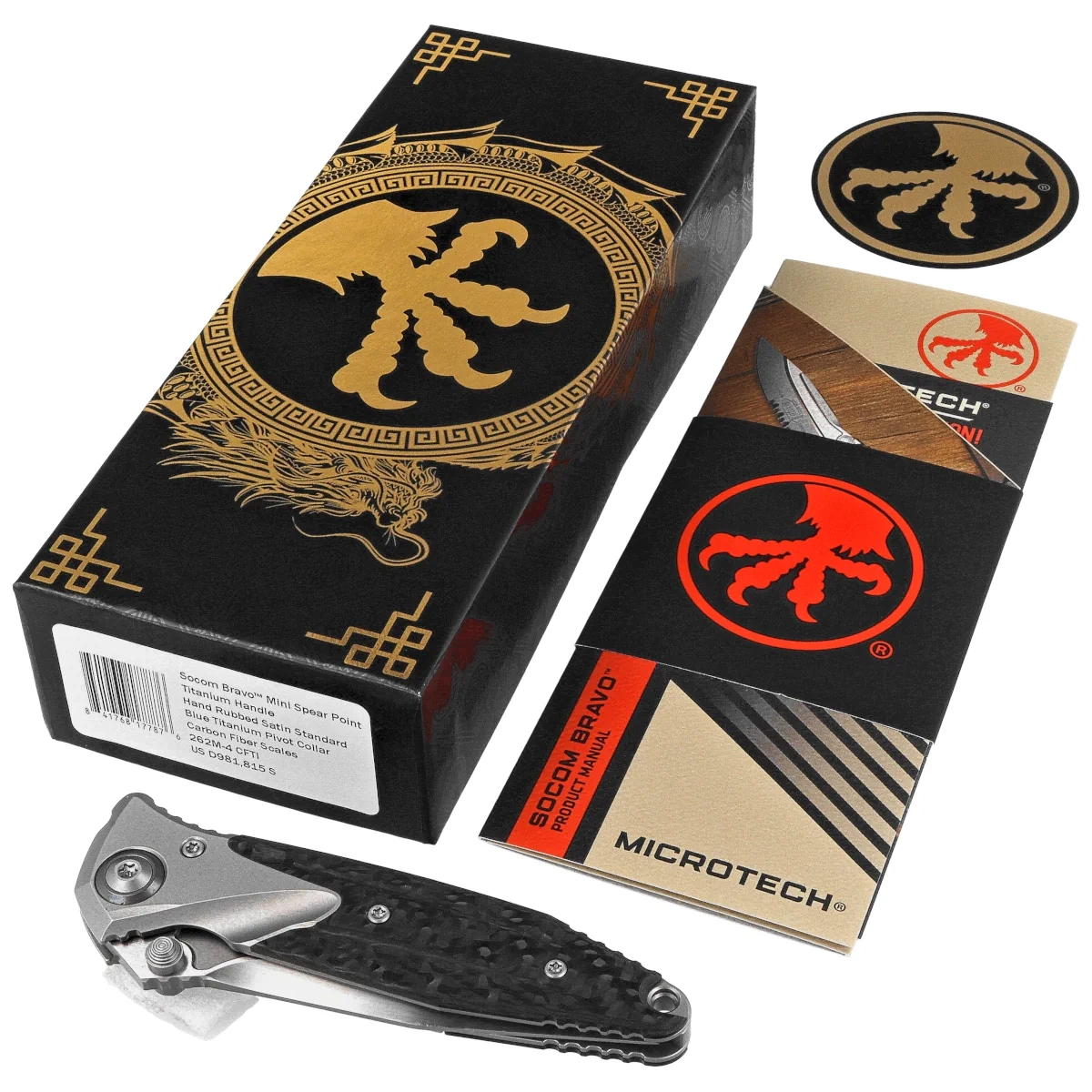 Microtech Socom Bravo Mini SP Knife Titanium/Carbon Fiber, Blue HW, Hand Rubbed Satin M390 by Tony Marfione (262M-4CFTI)
