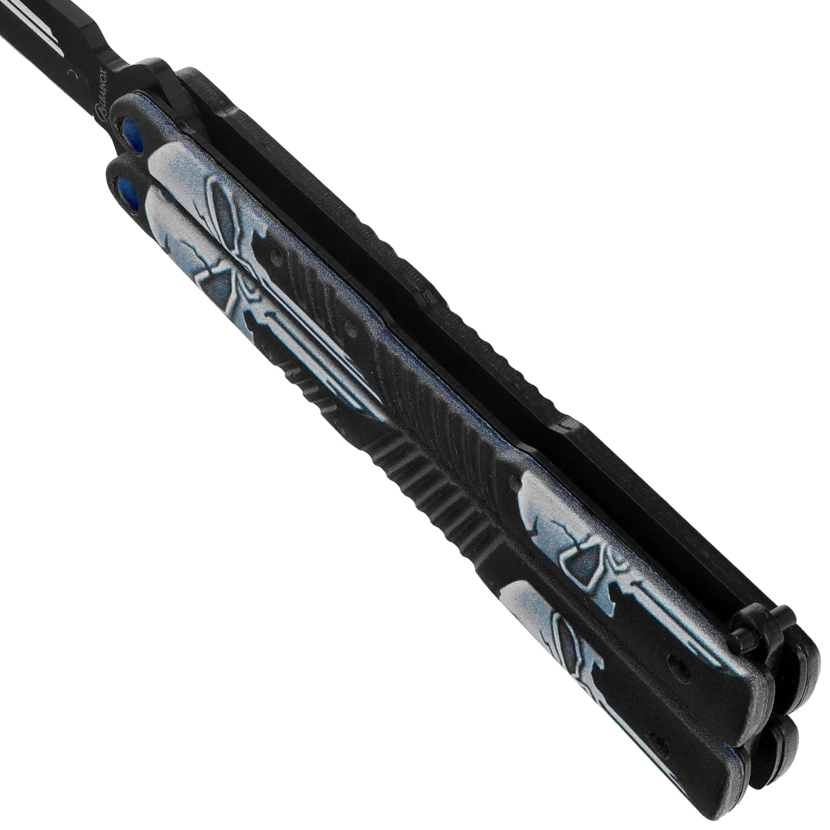 - Balisong Skulls Black Aluminum, Black 3Cr13Mov (02201) - a distinctive butterfly knife with dagger blade, blackened 3Cr13Mov steel and skull print. Striking design, durable construction, dynamic handling.