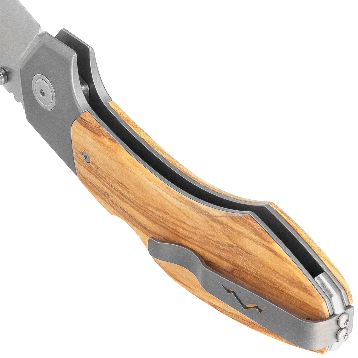 Handle - 6AL4V titanium bolsters , olive wood handle. Chamfered edges of the covers eliminate sharp edges. Grips are screwed to an intricately machined titanium backspacer, giving the assurance of many years of use. A two-position (right/left) deep-carry clip allows you to carry the knife discreetly in your pocket in the tip-up (blade tip up) position. In the back of the Handle a hole for threading a safety or decorative cord.