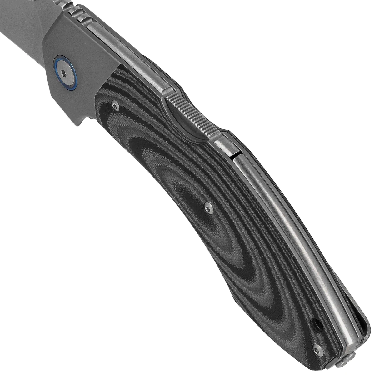 Blade - Drop Point type with clearly marked belly, finished masking minor scratches from use with Stonewashed method . The solid thickness of the blade combined with a high, flatgrind) gives an excellent cutting edge geometry and extreme cutting performance with high durability. Ball bearing system aids smooth opening of the blade, which can be opened with thumb studs on both sides . Locking mechanism Back Lock. On the back of the Blade notched upper jumping thumb rest .