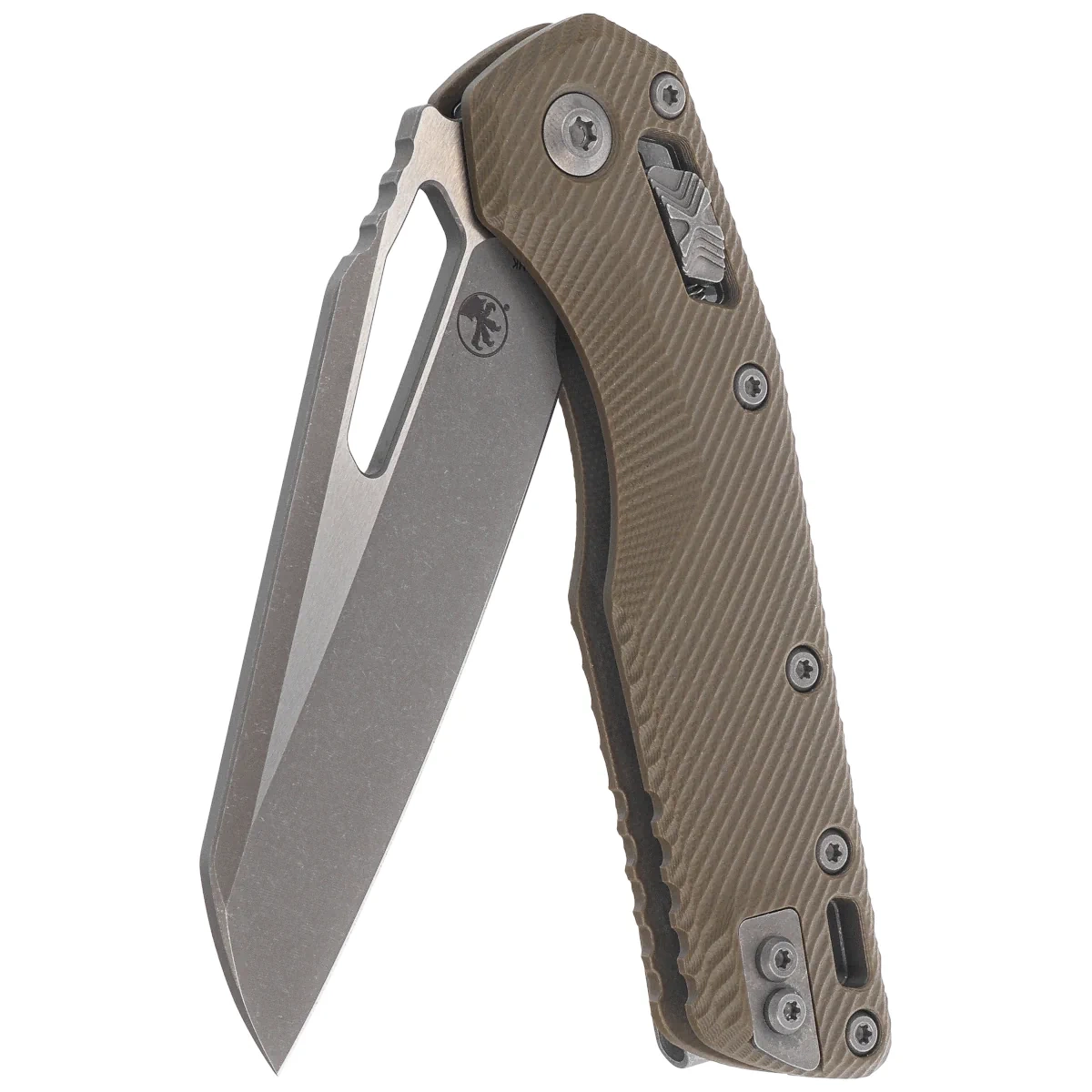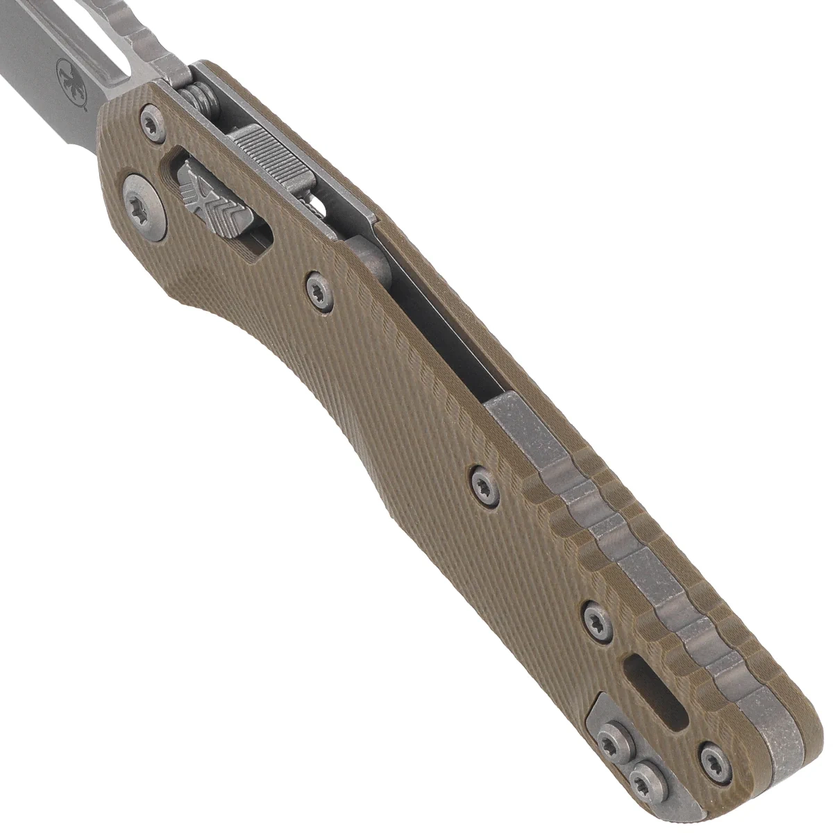 Handle - made of durable G10 composite, for better grip covered with milled lines(Fluted). Wide locking slide with Microtech's characteristic stepped X structure . Both grips are bolted together with a solid aluminum backspacer. The double-sided (right / left) clip allows you to discreetly carry the knife in tip-up position. Above the clip a lanyard hole, a place for a safety or decorative cord.