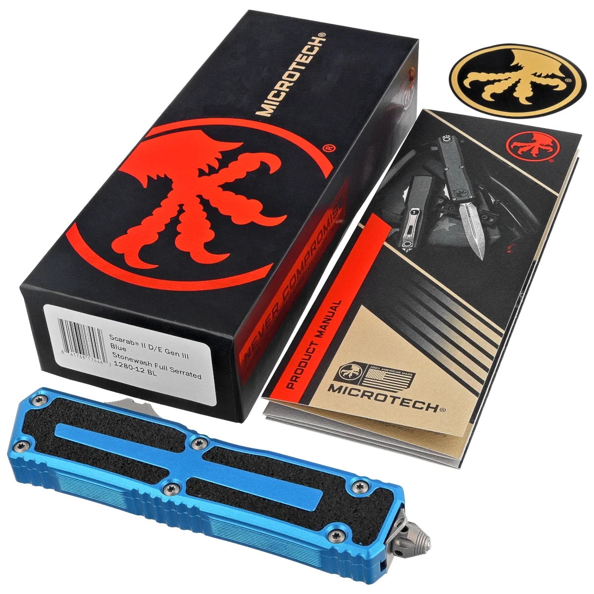 Scarab II Gen III D/E Blue Aluminum/3M, Stonewashed F/S is the pinnacle of excellence in automatic tactical knives, taking inspiration from the original Microtech Ultratech design. Built to withstand the toughest conditions, the new Scarab II is the ultimate choice for heavy use. While retaining the styling features of its predecessor, it sets a new standard for OTF (Out The Front) technology.