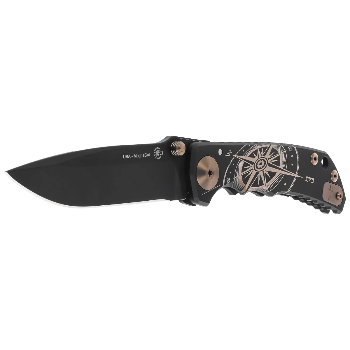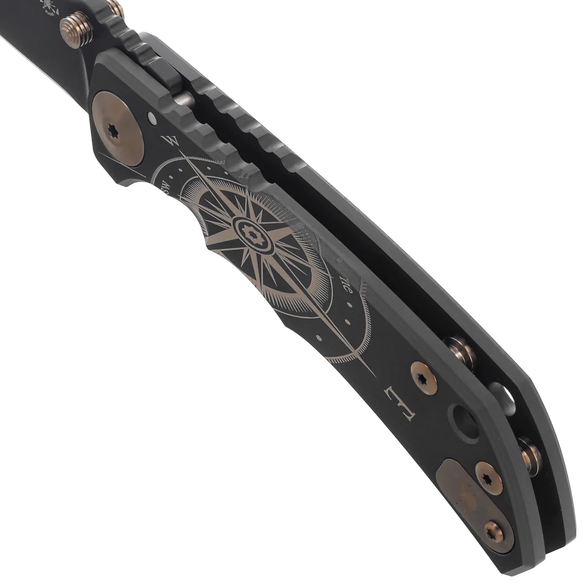 The solid titanium handle is decorated with an artistic engraving, depicting a compass motif with the Rose of the Winds. The whole is complemented by bronze anodized details, which contrast strikingly with the black color of the Handle. Thanks to the properly contoured handle, the knife sits securely in the hand, ensuring precision when performing a variety of activities. The robust frame lock mechanism guarantees safe use even in extreme conditions. Each piece is handmade in the USA, making it a valuable and sought-after item among both collectors and discerning users.