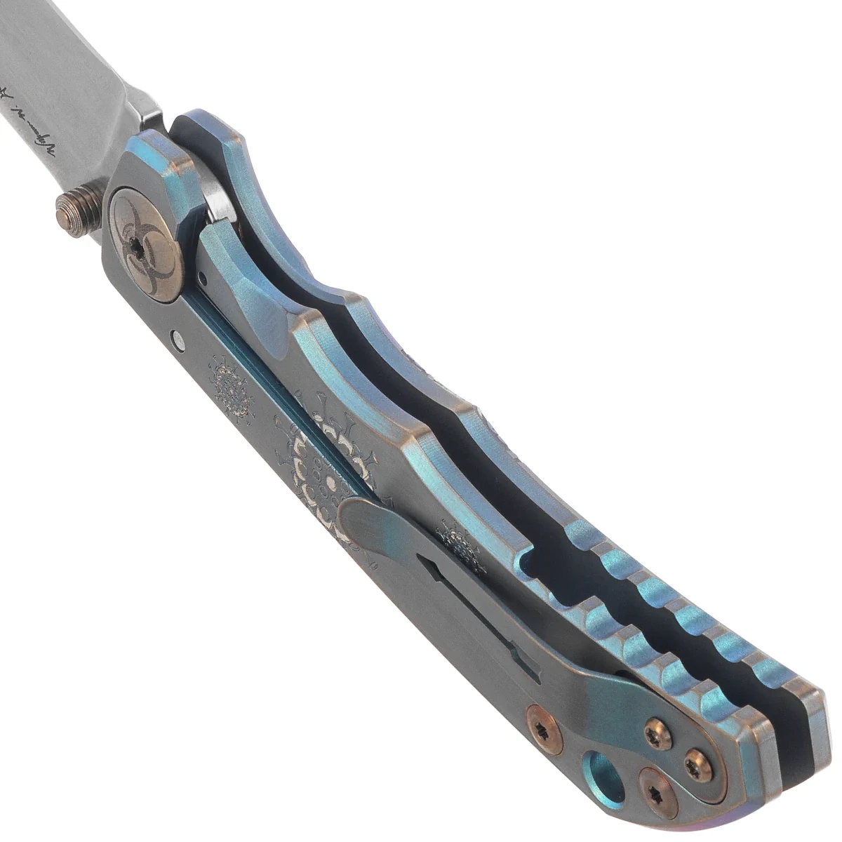Handle - made of solid titanium 6AL4V has beveled edges of the covers, eliminating sharp points. The surface is decorated with an artistic engraving depicting the Plague Doctor (Plague Doctor). The so-called open-backed design without the typical backspacer, attached with titanium spacer sleeves for easy cleaning. The simple but sturdy design guarantees many years of use. There are notches (jimping) on the edges of the Handle, improving grip security. The axis of the pivot is decorated with a designer screw, and all fasteners (screws, clip) are anodized blue. A double-sided (right/left) titanium clip, decorated with an arrow motif, allows the knife to be carried in tip-up position. Above the clip is a hole designed for threading a safety cord.