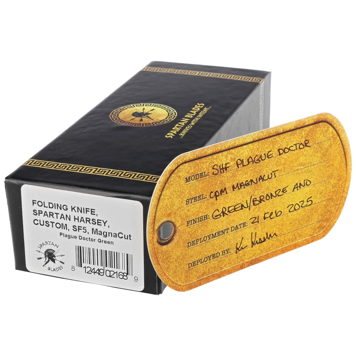 Spartan Harsey Folder Special Edition Plague Doctor Green Titanium, Bronze HW, Satin. “Spartan Harsey Folder” or“SHF” is considered a masterpiece among tactical knives. Designed by knifemaking legend Bill Harsey , it was produced in a limited edition. Winner of the 2016 American Made Knife of The Year award at the Blade Show in Atlanta.