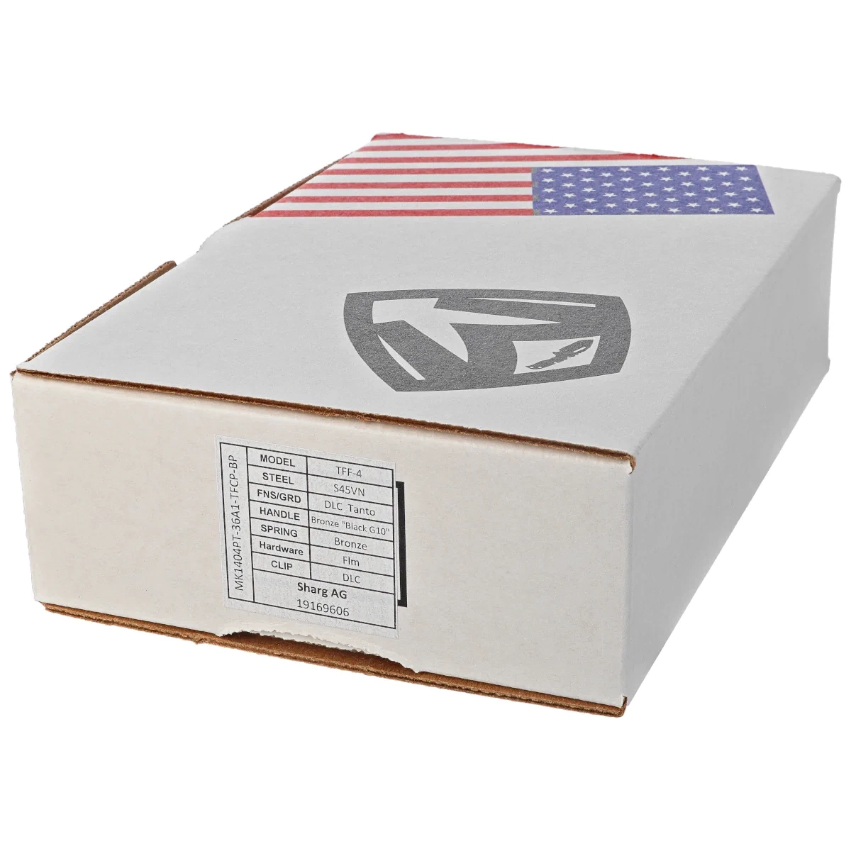 - TFF-4 Tanto Bronze Titanium/Black G10, Flm HW, Std Clip, Black DLC premium tactical knife by Greg Medford. Blade made of S45VN steel, Handle made of titanium and G10 composite. A reliable EDC tool for extreme tasks.