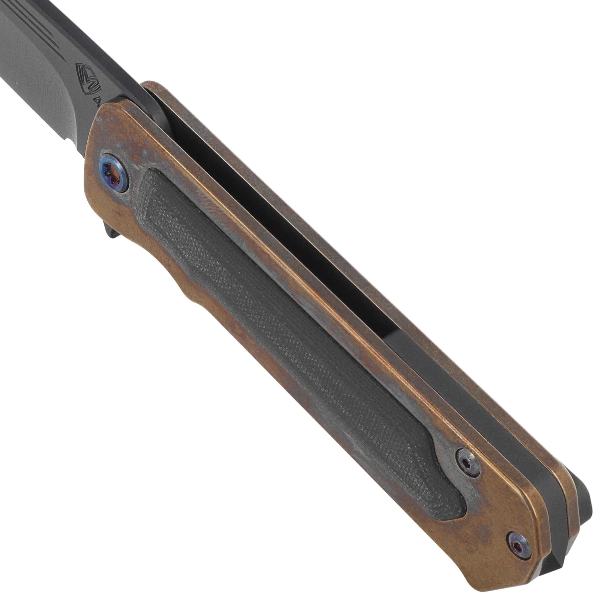 TFF-4 Tanto Bronze Titanium/Black G10, Flm HW, Std Clip, Black DLC is an uncompromising tool designed by Greg Medford, known for his ruthlessly durable designs based on technical and utility aesthetics. This knife represents a compact heavy duty tactical folder, designed for professional users, knife enthusiasts and collectors looking for top-notch solutions. The distinctive rectilinear body design and selectively chosen materials make the TFF-4 one of the most robust knives in the Medford Knife & Tool catalog. Blade is made of corrosion- and abrasion-resistant CPM S45VN steel , coated with black DLC. The drop point profile and hollow grind provide versatility in applications, combining tip strength with high cutting efficiency. Opening is done with a flipper, which allows the blade to be unfolded quickly, intuitively and securely, even when wearing gloves. The handle is made of two types of materials - the main construction is based on titanium, while the central inserts made of G10 improve the grip and increase control over the tool. The design with a solid backspacer provides the desired rigidity, while the profiled shape of the Handle allows for a safe and comfortable grip in various positions. A deep carry clip and color-matched screws and bushings complete the package. The TFF-4 is the choice for those who value maximum durability, uncompromising aesthetics and true utility.