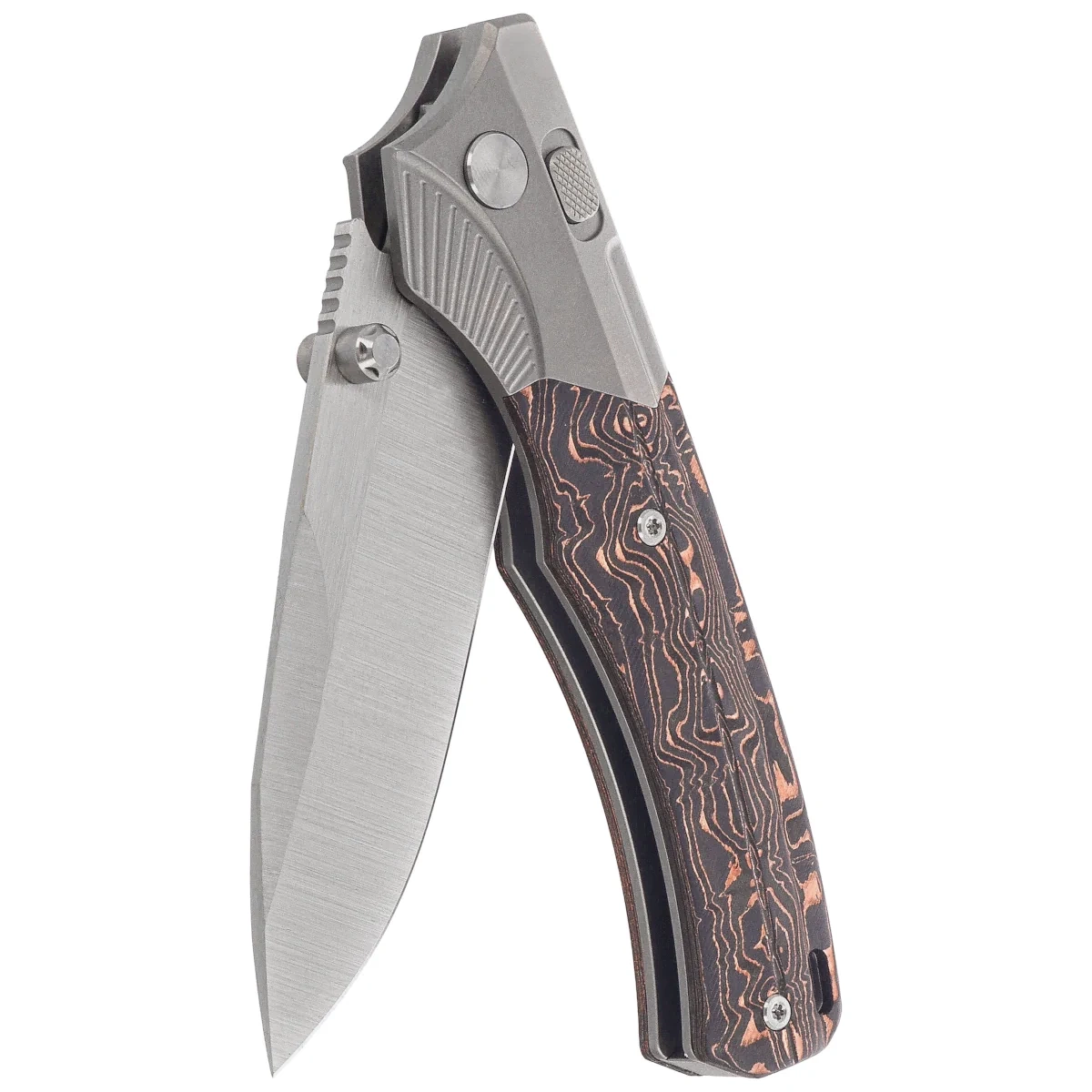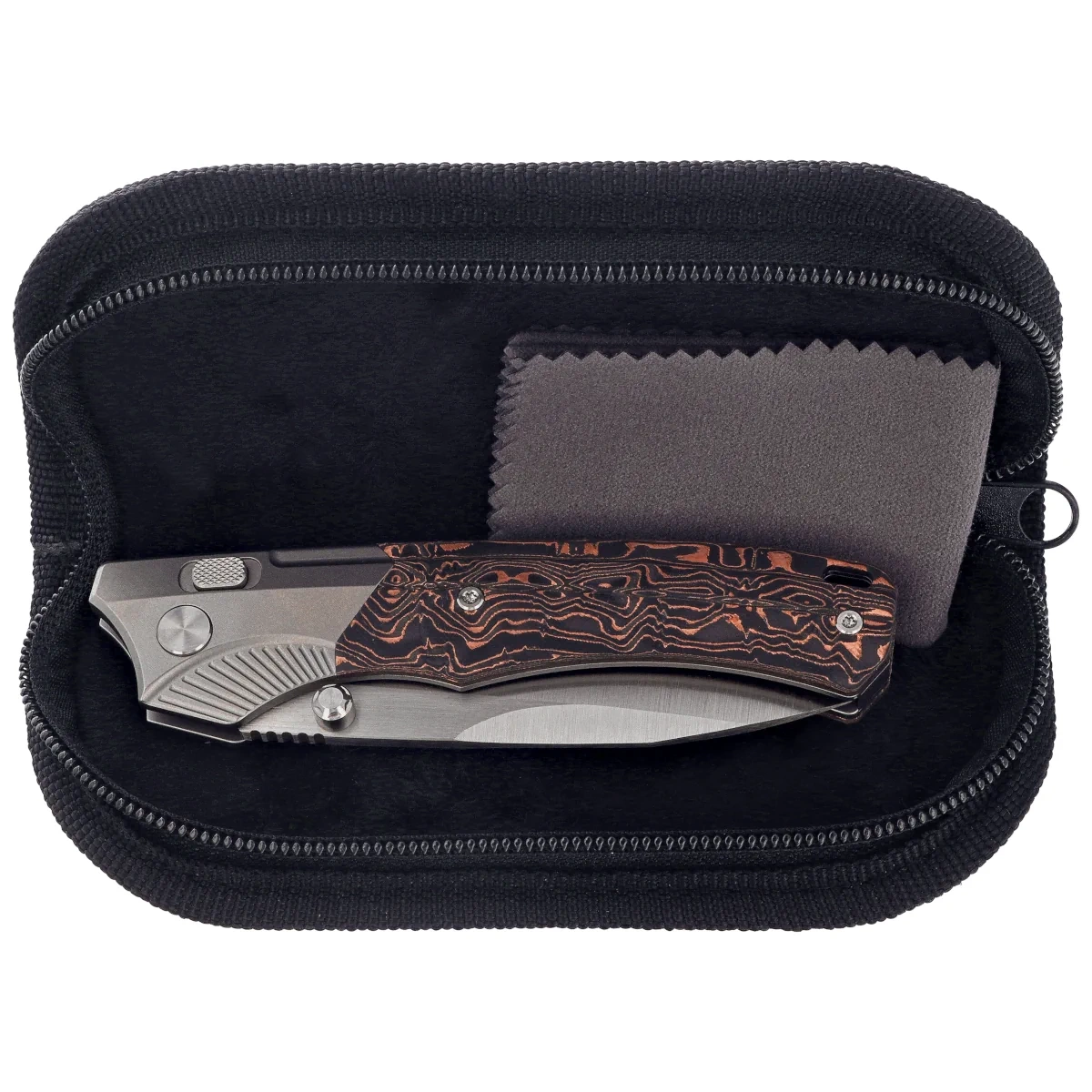 Handle - made of 6AL4V titanium , also coated with black DLC. Chamfered edges of the covers eliminate sharp edges. The grips are screwed to a solid titanium backspacer, ensuring that the desired rigidity of the entire structure is maintained. On the left side, a wide Button Lock button, placed in a recess to avoid accidental opening. A single-position (right) titanium deep-carry clip allows you to carry the knife discreetly in your pocket in tip-up position (blade tip up). Above the clip is a hole (Lanyard hole) for threading a safety or decorative cord.