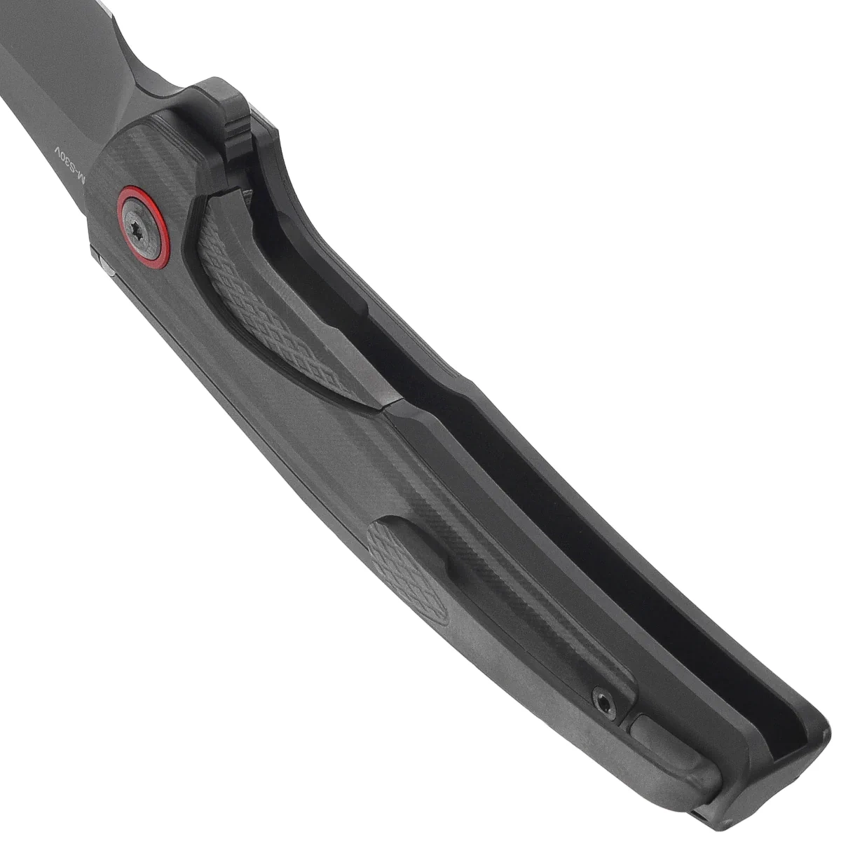 Handle - a monolithic handle made of a single piece of anodized aluminum stands out for its high rigidity and low weight, thanks to precision CNC machining. The carbon fiber inlay brings lightness and technical aesthetics, contrasting with the matte structure of the aluminum. The contoured grip lines and ergonomic cutouts improve comfort, while the frame lock guarantees a secure locking of the blade in the working position. The pivot is decorated with a red ring. The overall design is characterized by excellent balance and will prove useful both for everyday carry and as part of an advanced EDC collection.