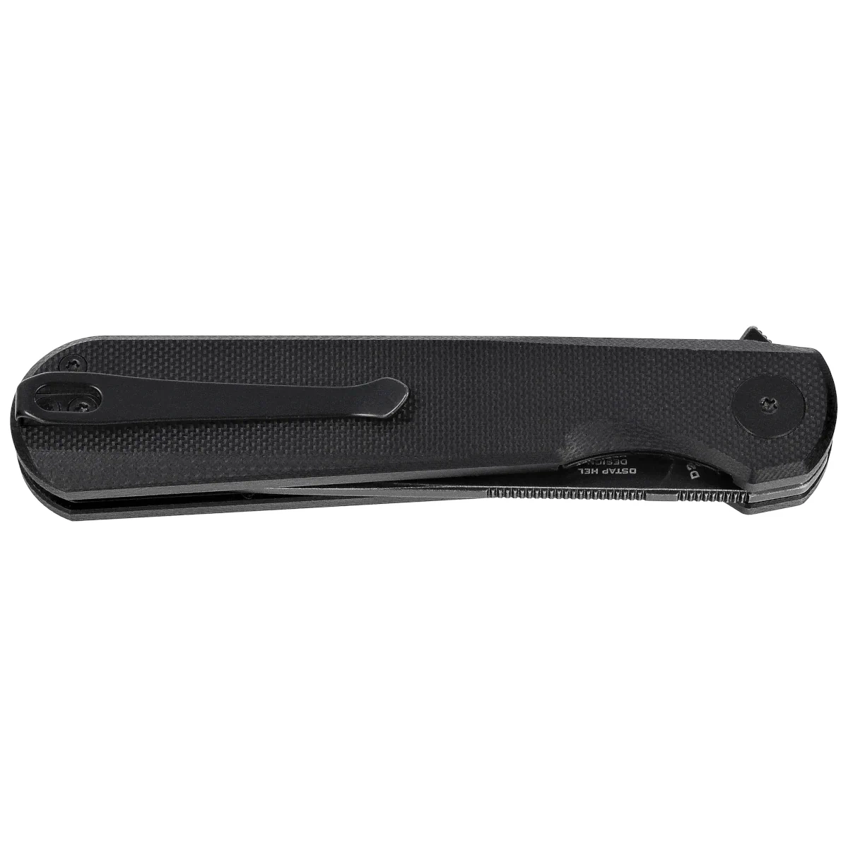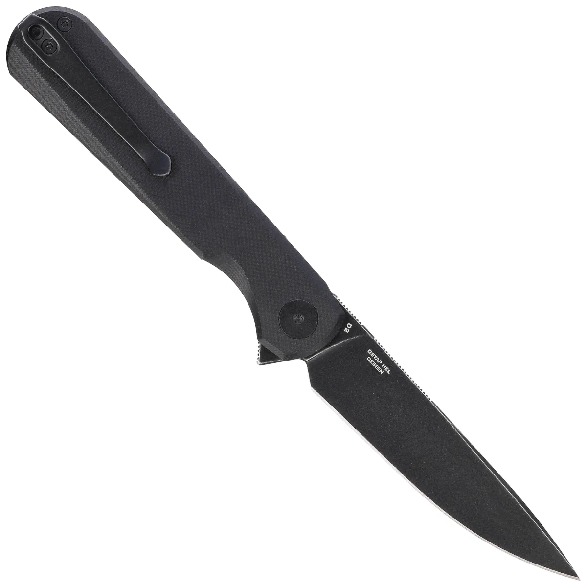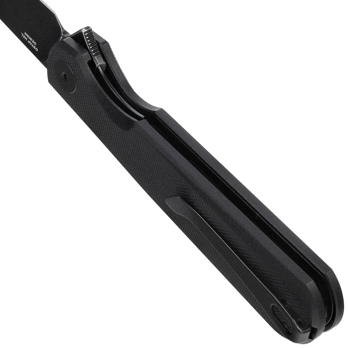 • Flick Black G10, Black Stonewashed, an EDC folding knife designed by Ostap Hel, with a drop point blade in D2 tool steel and a G10 composite handle. Liner lock, styling based on principles of utility geometry.