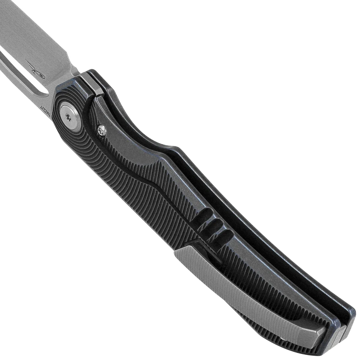 Handle - made of milled titanium form a consistent, rigid construction with a distinctly technical character. Dense, rhythmic milling not only emphasizes the aesthetics of the design, but also improves the non-slip properties of the handle. The frame lock has been reinforced with a steel inlay, which ensures durability and reliable operation even under heavy use. The use of a deep carry clip made of titanium allows the knife to be carried comfortably and unobtrusively in the pocket. The carefully contoured shape of the Handle and the balance of the whole promote comfort - even with prolonged use.