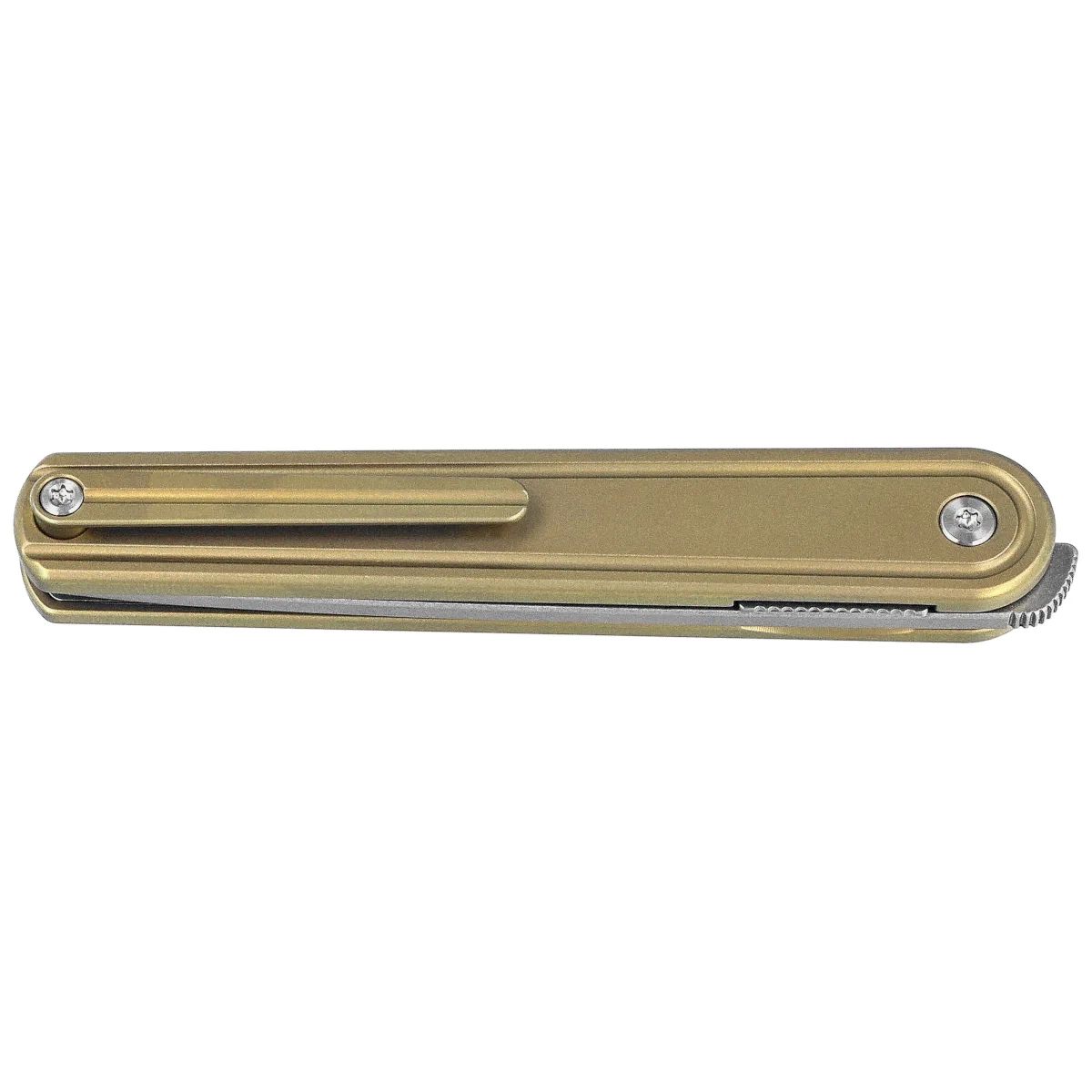 Handle - made of anodized titanium provides structural rigidity and durability while maintaining very low weight. Smoothly routed lines and CNC milling improve the ergonomics of the grip, and the integrated deep carry clip allows for convenient and discreet carrying. Hidden screws and precise fit of the components emphasize the modern, minimalist character of the model. The interior has been further relieved by internal milling, which reduces the weight of the structure without compromising its rigidity. The overall design has been refined for everyday reliability and elegant aesthetics.