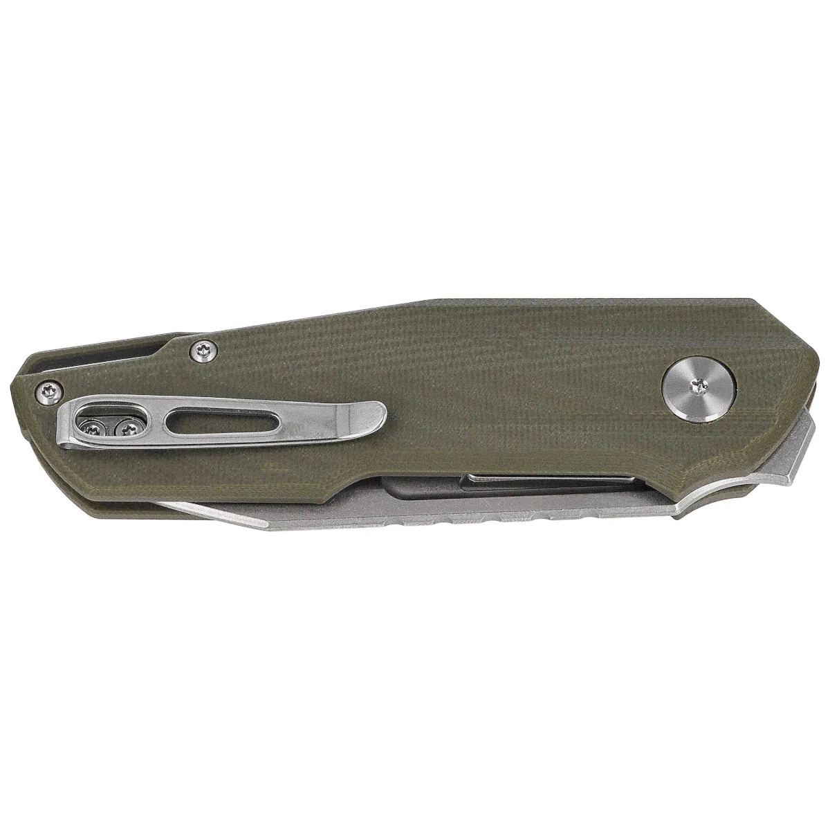 Handle - designed for full control and comfort while maintaining a compact size. G10 composite grips with a lightweight texture and matte finish provide a secure grip, even in wet environments. Ergonomic cont ouring with a pronounced index finger undercut improves stability for precision tasks. There is a milling (jimping) on the back to further enhance thumb grip. Internal steel liners reinforce the entire structure and are an integral part of the liner lock system, which securely holds the blade in the open position. A deep-carry clip allows the knife to be carried discreetly in a pocket, and a hole in the back of the Handle allows the installation of a safety cable. The whole is completed by a decorative pivot with a graphic detail - the designer's trademark.