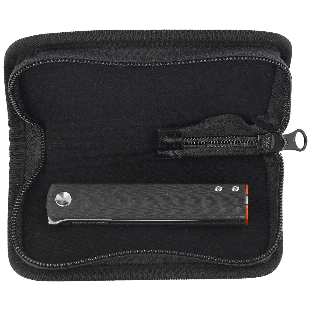 Handle - made of 3K Carbon Fiber composite, a material that provides high strength and exceptional lightness. Its surface has been gently textured to improve grip, and the ergonomic profiling increases holding comfort even during prolonged work. The orange anodized backspacer stiffens the design and introduces a dynamic styling accent. The user has a double-sided deep-carry clip for discreet carrying and a liner lock, which guarantees security during use. It comes with an elegant pouch made of high-quality leather for storing and carrying the knife.