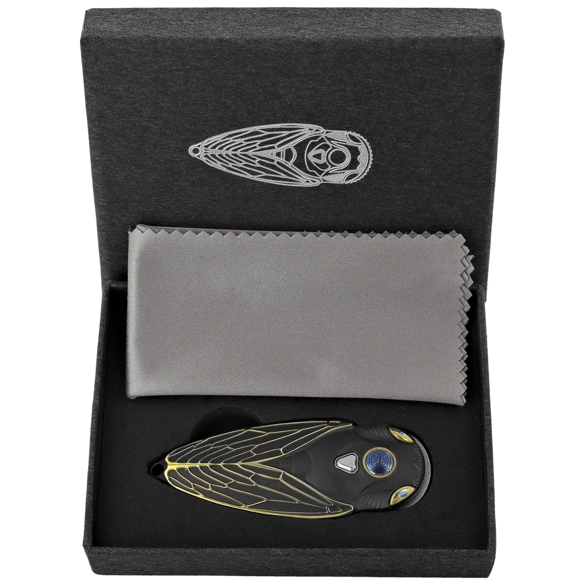 - Cicada-DG Dark Gray / Gold Titanium, Bead Blasted - a modern premium folding knife from Rike Knife, with an M390 steel blade and milled titanium handle. Biomechanical form, collectible character and technical precision in one design.
