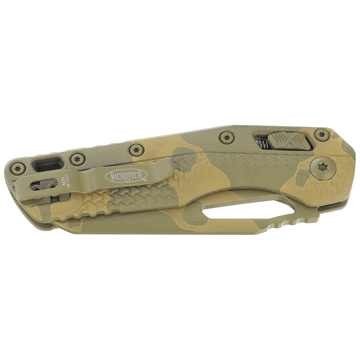 Handle - made of durable polymer in Bazooka Camo. For a better grip covered with Tri-Grip texture. Wide locking slide with Microtech's characteristic stepped X structure. Both grips are bolted together with a solid aluminum backspacer. The double-sided (right / left) clip allows you to discreetly carry the knife in tip-up position. Above the clip a lanyard hole, a place for a safety or decorative cord.