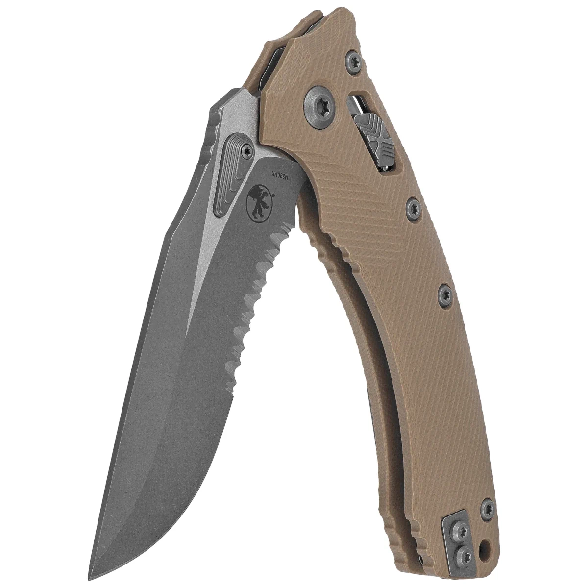 Handle - made of durable G10 composite, for better grip covered with milled lines(Fluted). Wide locking slide with Microtech's characteristic stepped X structure . Both grips have been screwed together with a solid backspacer. A double-sided (right / left) titanium clip allows you to discreetly carry the knife in tip-up position. Above the clip a lanyard hole, a place for a safety or decorative cord.