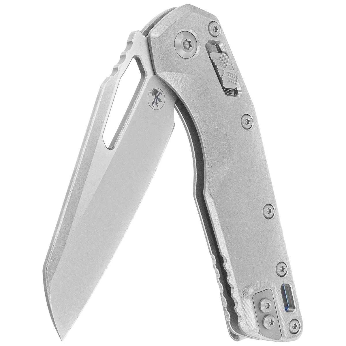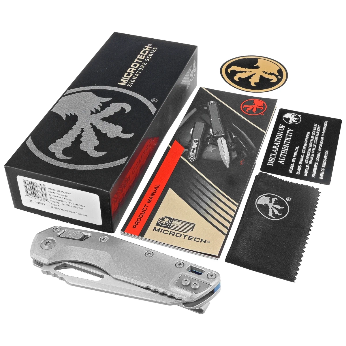 Handle - made of durable titanium, Stonewashed finish for better grip . Wide locking slide with Microtech's characteristic stepped X structure . Both grips are bolted together with a solid titanium backspacer in bronze. A double-sided (right/left) titanium clip allows the knife to be carried discreetly in tip-up position. Above the clip a lanyard hole, a place for a safety or decorative cord.