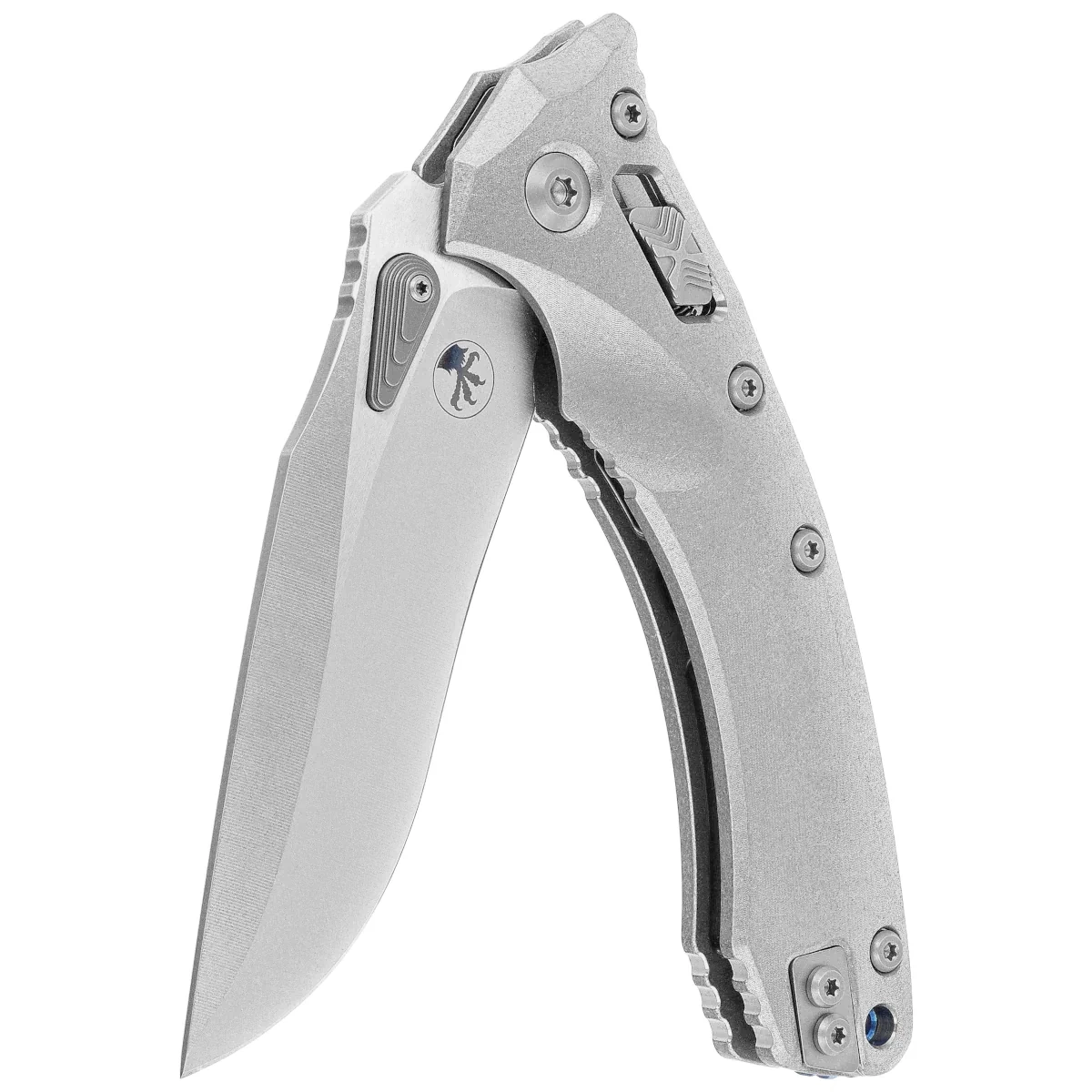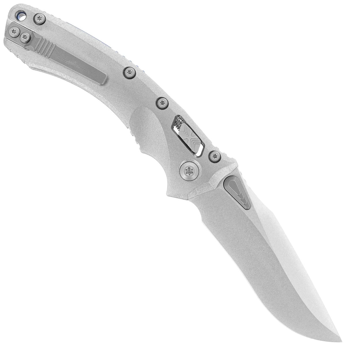 Handle - made of durable titanium, Stonewashed finish for better grip . Wide locking slide with Microtech's characteristic stepped X structure . Both grips are bolted together with a solid titanium backspacer in blue. A double-sided (right/left) titanium clip allows the knife to be carried discreetly in tip-up position. Above the clip a lanyard hole, a place for a safety or decorative cord.