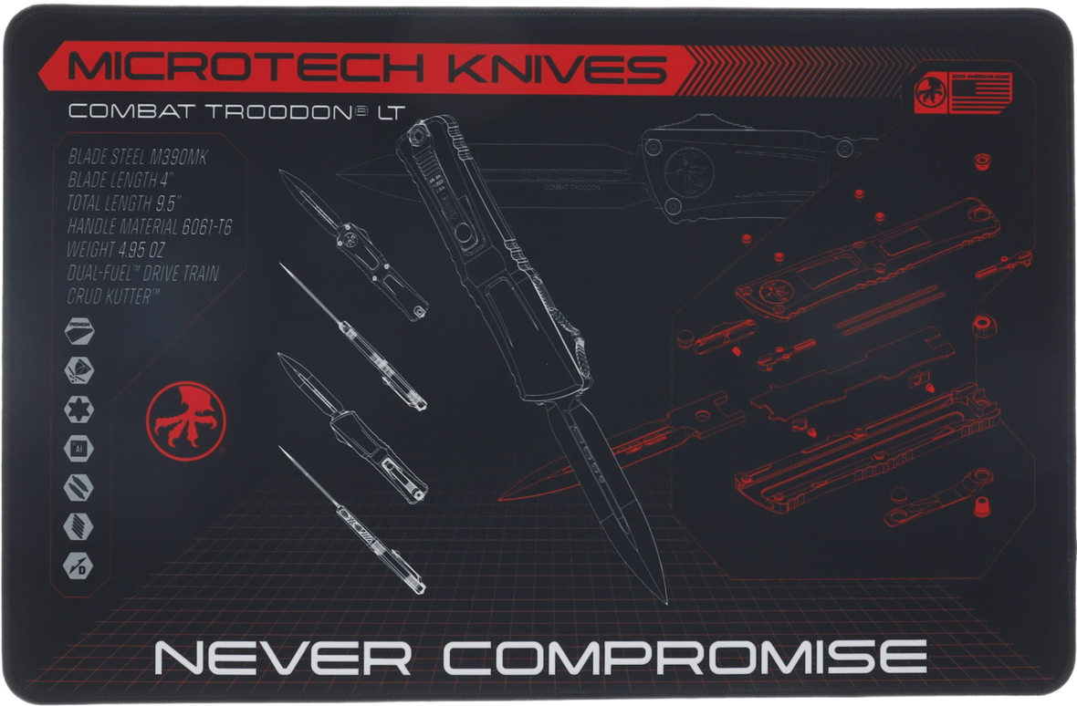 At the center of the composition is the design diagram of the Combat Troodon model, one of the most recognizable OTF knives in the Microtech range. The detailed CAD-type illustration presents an exploded view of the main components, making the mat not only visually striking, but also educational and practical for enthusiasts of the technical aspects of knife construction.