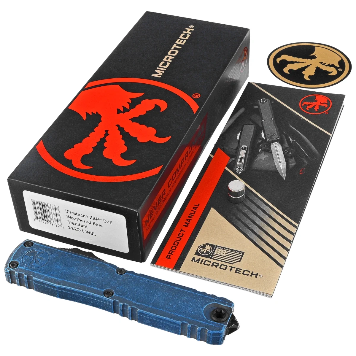 - Ultratech Gen 3 ZBP D/E Cerakote Weathered Blue Aluminum, Cerakote Weathered Blue is an upgraded version of the iconic Microtech knife: new glass striker, Crud Kutter system, Dual-Fuel Drive Train and Zero Blade Play™ - no blade play when unfolded.