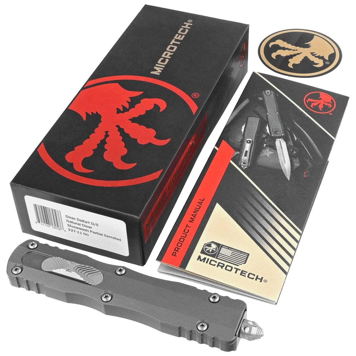 - Dirac Delta D/E Natural Clear Aluminum, Stonewashed P/S larger version of the Dirac series OTF automatic knife. Operating in D/A mode, it features a fast blade extension mechanism. Slider button on the side of the handle. Designed by Tony Marfione.