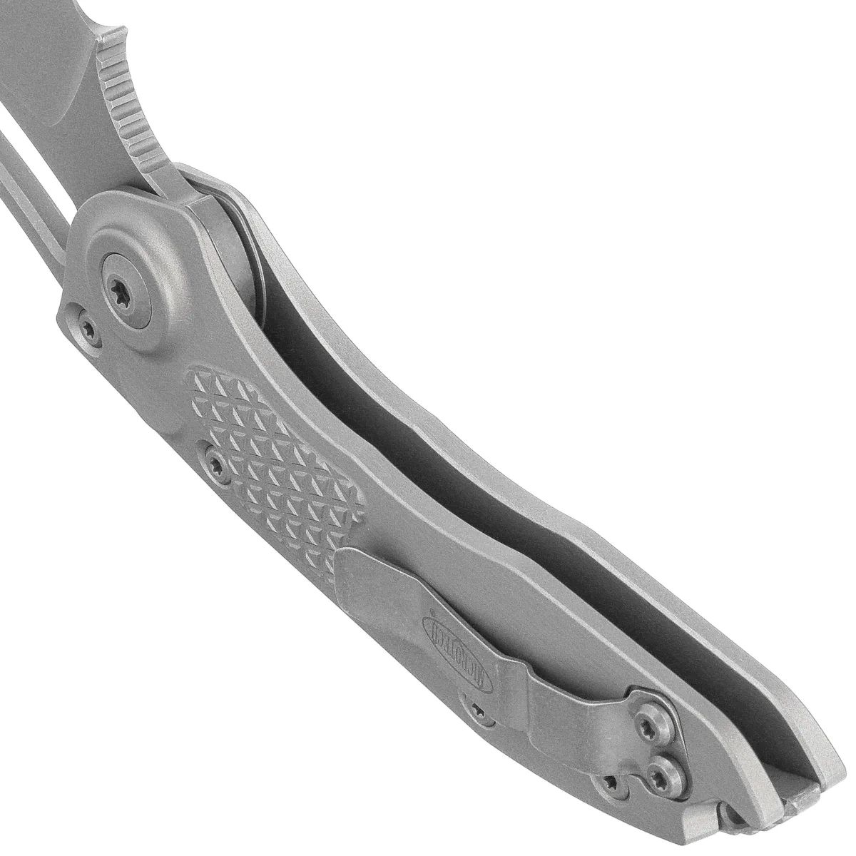 Handle - made on CNC milling machines with excellent precision, from 6061-T6 Aluminum with deeply milled Tri-Grip structure. The knife's wide opening button has been recessed to prevent accidental opening. Both grips have been bolted together using a solid aluminum backspacer. A double-sided (right/left) clip allows the knife to be carried discreetly in the tip-up position. The protruding part of the backspacer in which there is a hole for a rope, can also serve as an improvised glass breaker.