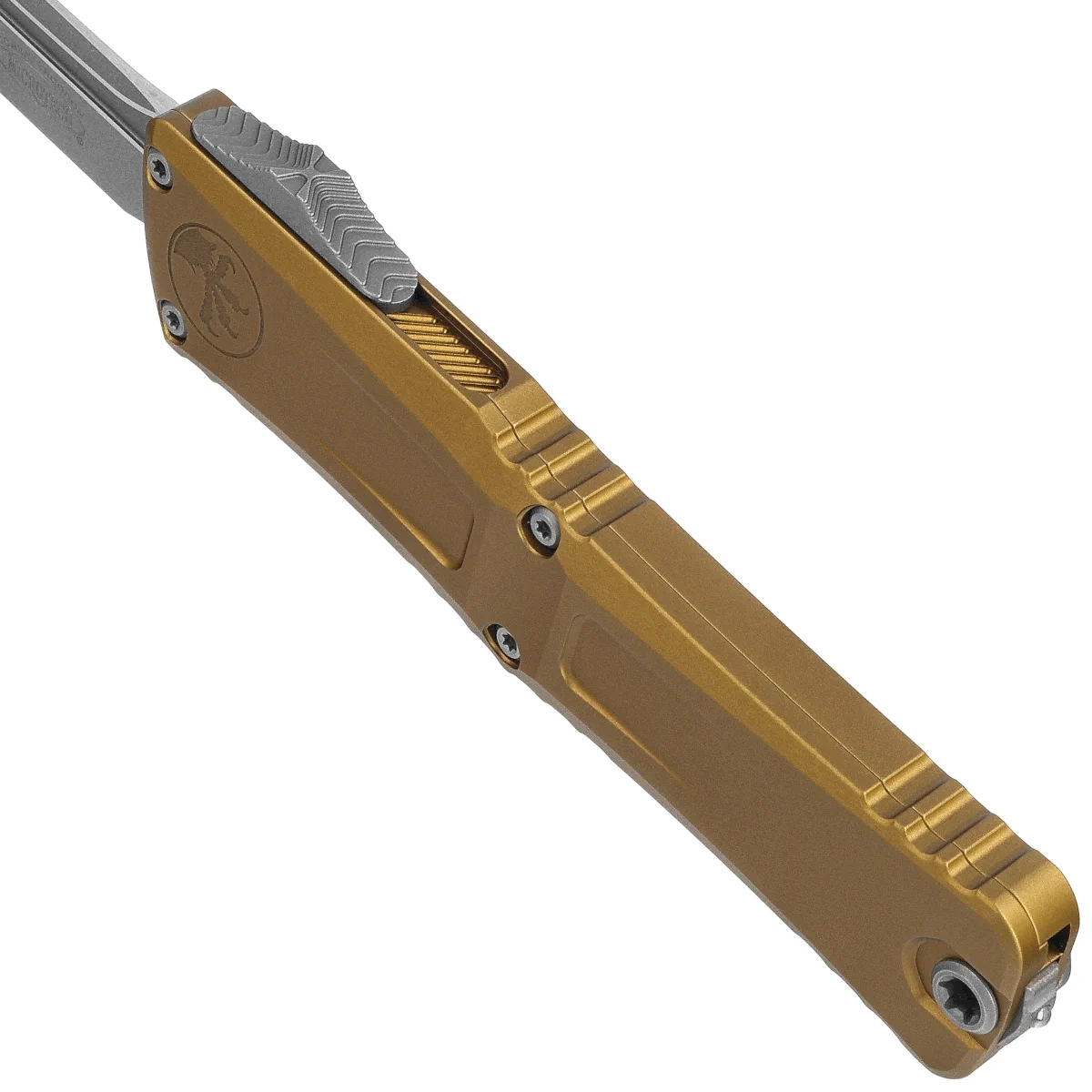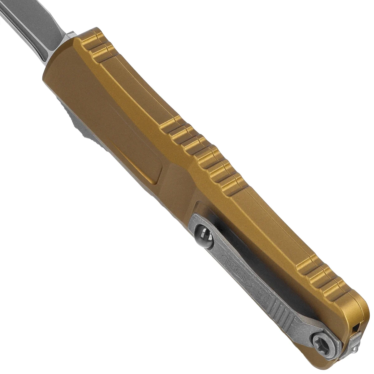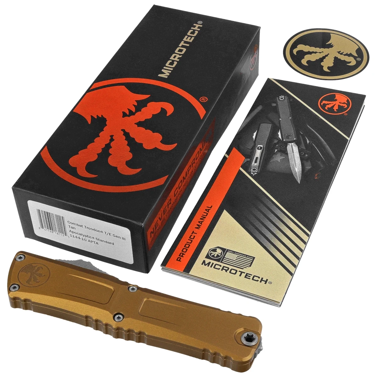 Combat Troodon Gen III T/E Tan Aluminum, Apocalyptic this largest of the automatic knives is the pinnacle of precision engineering and tactical prowess in the field of OTF (Out The Front) knives. Built for a wide range of utility applications, it boasts a 25% larger size compared to the flagship Troodon. Precisely crafted, it features a sophisticated and hellishly fast mechanism that extends the razor-sharp blade. 100% made and assembled in the USA. Designed by Anthony Marfione, knifemaker and owner of Microtech Knives.