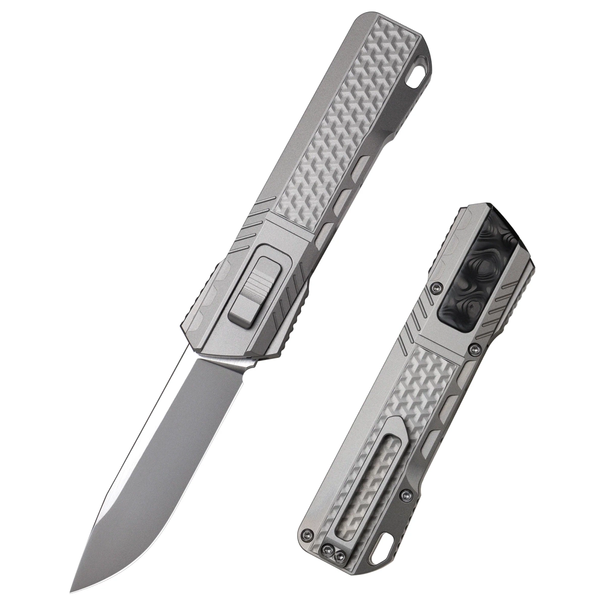 • RT-Sharp Leopard Titanium, Manual Fine Grinding Pearlescent/Manual Wire Drawing compact EDC folder from the young Remette Knives manufactory. OTF with a blade that extends due to the force of gravity. Titanium Handle with innovative blade release system.
