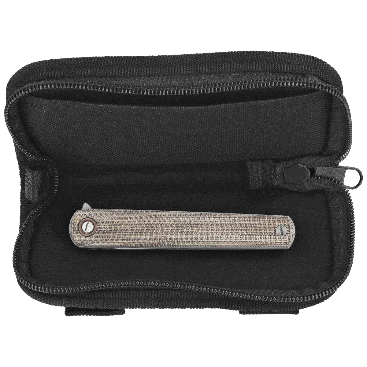 Handle - made of Canvas Micarta, a material that combines low weight with high wear and weather resistance. The slightly textured surface increases grip, even in humid environments. Construction based on steel liners bolted together using a spacer sleeve provides rigidity with minimal weight. A double-sided deep carry clip allows the folder to be carried discreetly in a pocket by both right- and left-handed users. A subtle anodized ring detail around the pivot adds a distinctive touch to the design. The folder comes in a soft Cordura case with zipper and belt-tie option - ideal for safe carrying or storage. T6/T8 torx wrenches are also included.