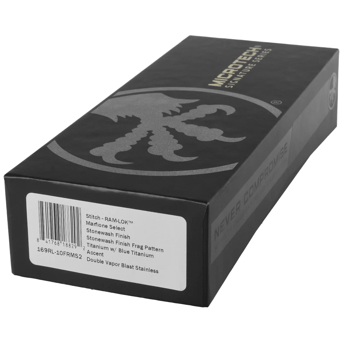 - Stitch Ram-Lok S/E Frag Titanium, Double Vapor Blast HW, Stonewashed manual version of the knife from Bork Blades and Microtech. M390MK steel blade, Frag Pattern titanium handle, blue titanium backspacer. Elite Marfione Select Signature Series