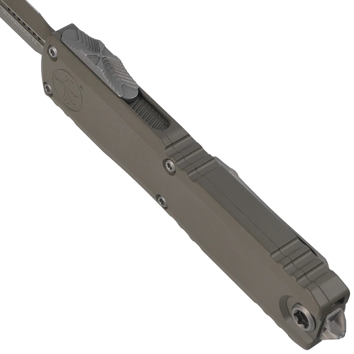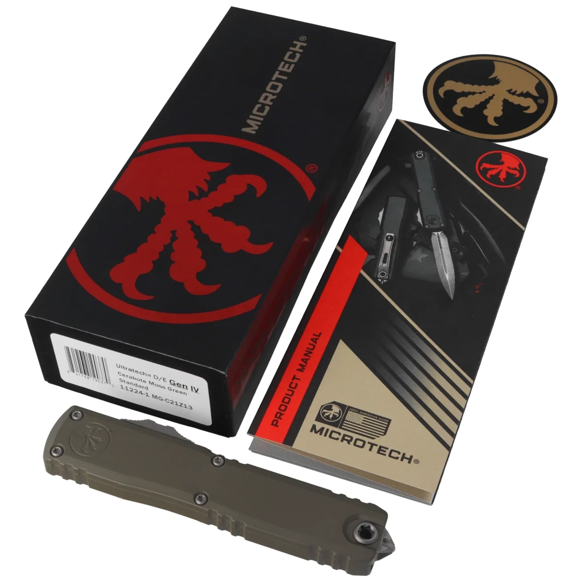 • Ultratech Gen IV D/E Cerakote Moss Green Aluminum, Cerakote Moss Green is a full-size OTF automatic knife from Ultratech. Operating in D/A mode, Blade made of Böhler M390MK steel, precision machined aluminum Handle. Designed by Tony Marfione.