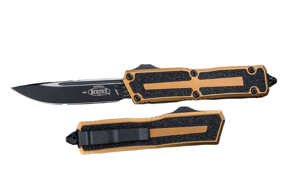 The Scarab II Gen III S/E Tan Aluminum, Black is the pinnacle of excellence in automatic tactical knives, drawing inspiration from the original Microtech Ultratech design. Built to withstand the toughest conditions, the new Scarab II is the ultimate choice for heavy use. While retaining the styling features of its predecessor, it sets a new standard for OTF (Out The Front) technology.