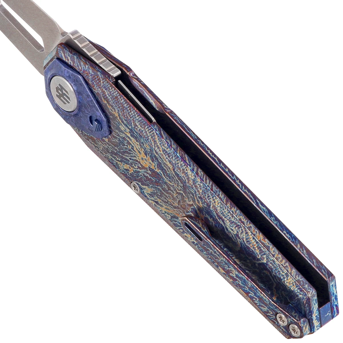 Handle - made of heat-dyed titanium 6AL-4V stands out for its minimalist design and balanced construction, providing ergonomics, durability and low weight. The milled lines increase grip and add technical character, while the precisely rounded edges take care of grip comfort. A decorative inlay around the pivot highlights the workmanship detail, combining aesthetic value with custom design symbolism. The button liner lock guarantees rigidity and safety in use, while the deep carry clip allows you to carry the knife comfortably in your pocket. There is also a lanyard hole on the back of the backspacer - a practical element for increased portability and personalization.