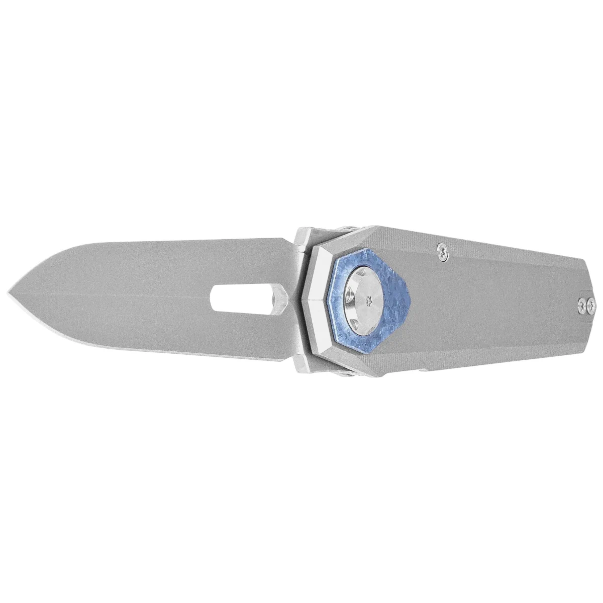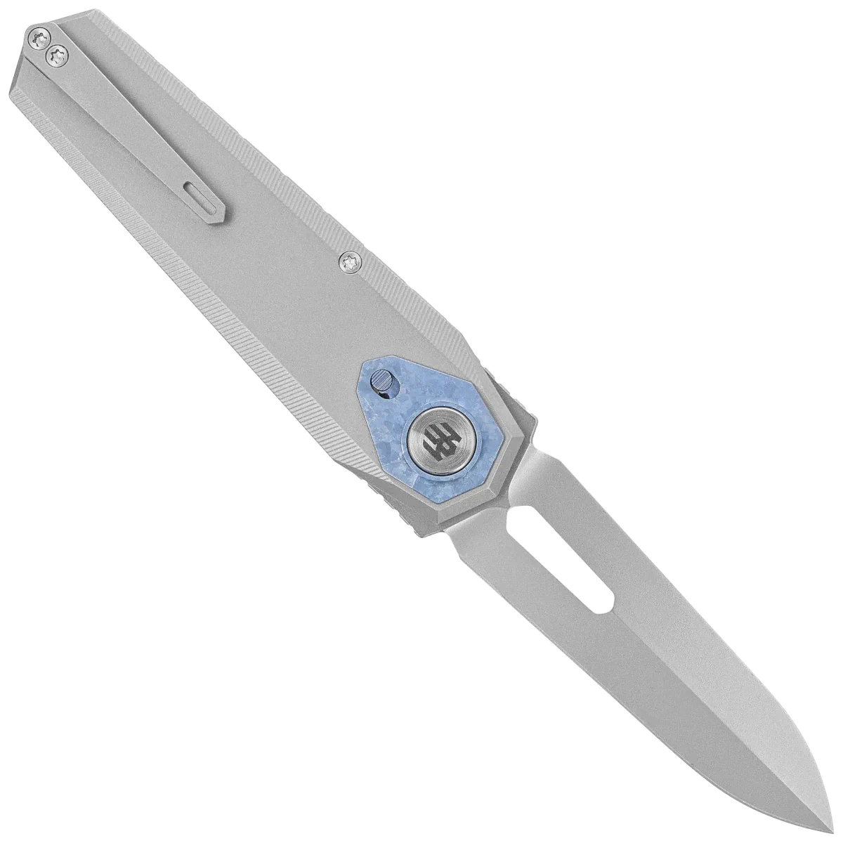 Handle - made of titanium 6AL-4V is distinguished by its minimalist design and balanced construction, providing ergonomics, durability and low weight. The milled lines increase grip and add technical character, while the precisely rounded edges take care of grip comfort. A decorative inlay around the pivot highlights the workmanship detail, combining aesthetic value with custom design symbolism. The button liner lock guarantees rigidity and safety in use, while the deep carry clip allows you to carry the knife comfortably in your pocket. There is also a lanyard hole on the back of the backspacer - a practical element for increased portability and personalization.
