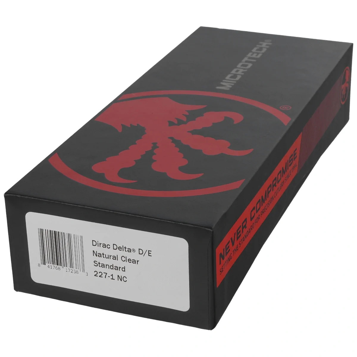 Dirac Delta D/E Natural Clear Aluminum, Black is an enlarged OTF automatic knife from the Dirac series. Operating in D/A mode , it features a hellishly fast blade extension mechanism. Slider button on the side of the handle. 100% made and assembled in the USA. Designed by Anthony Marfione, knifemaker and owner of Microtech Knives.
