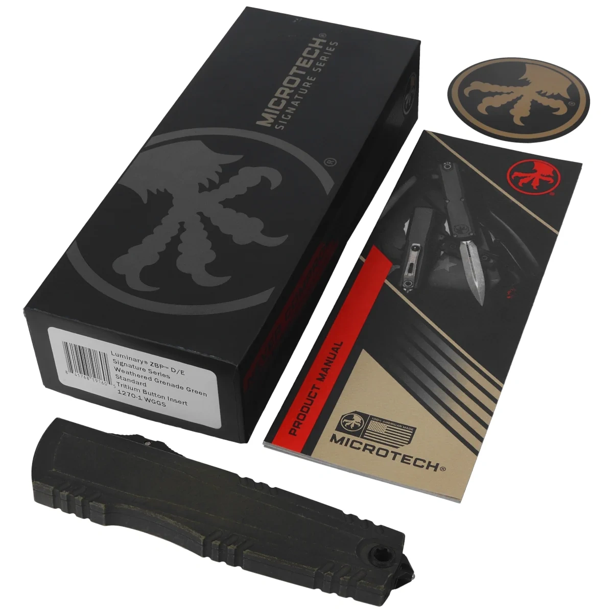 Microtech Luminary ZBP D/E Signature OTF Knife Weathered Grenade Green Aluminum, Weathered Grenade Green M390MK by Tony Marfione (1270-1WGGS)