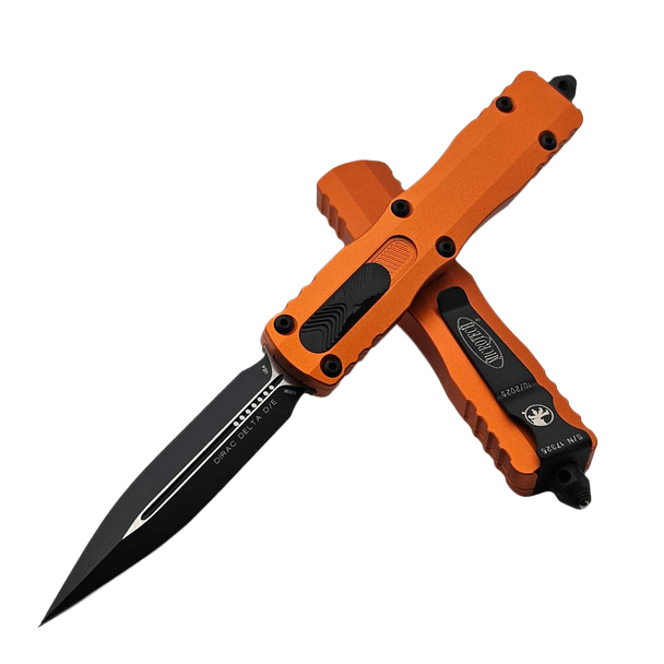 Dirac Delta D/E Orange Aluminum, Black is an enlarged OTF automatic knife from the Dirac series. Operating in D/A mode , it features a hellishly fast blade extension mechanism. Slider button on the side of the handle. 100% made and assembled in the USA. Designed by Anthony Marfione, knifemaker and owner of Microtech Knives.