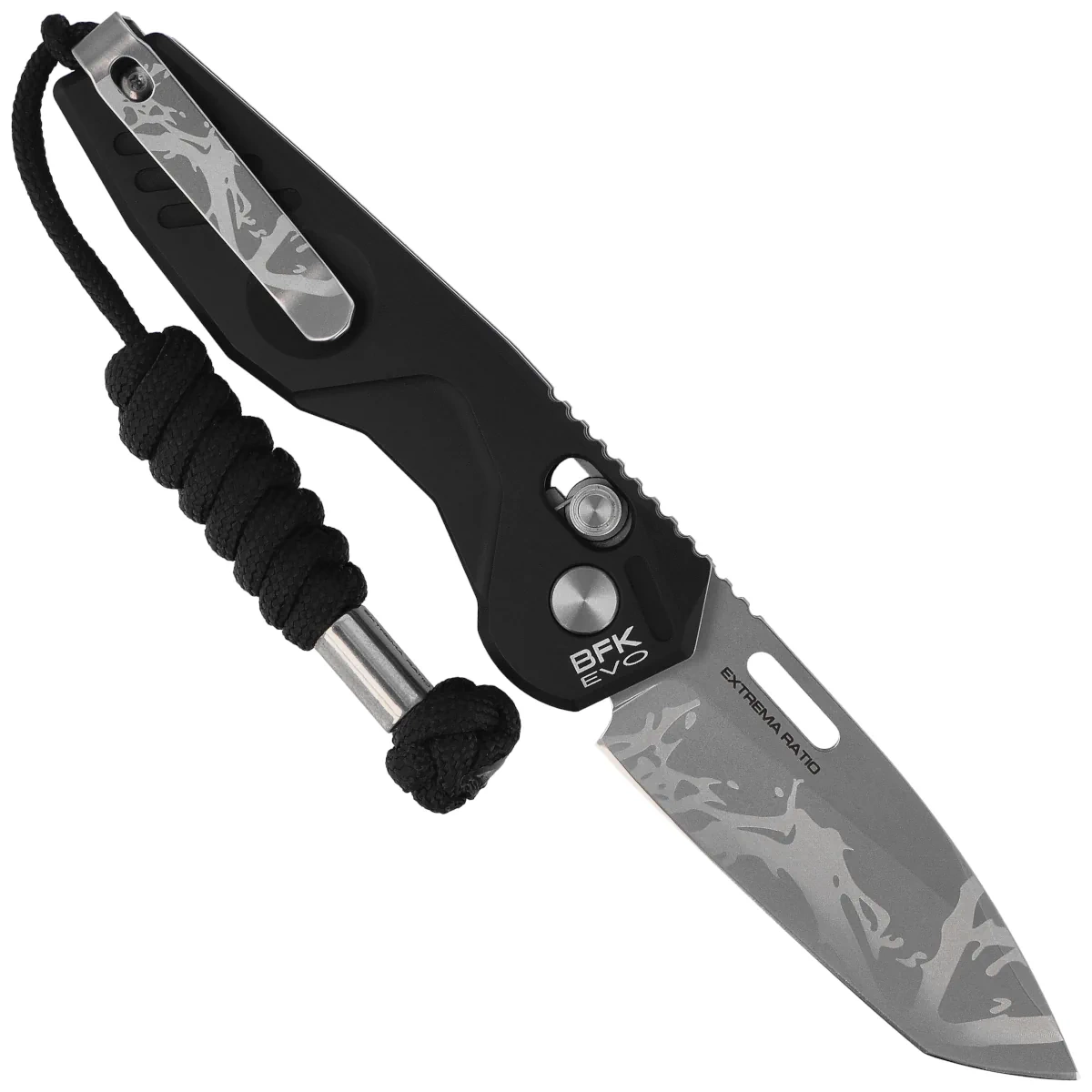 At the center of the set is the BFK EVO LE folder , produced in a quantity of only 500 pieces. The knife has an individual serial number (here: 216/500), and its design is based on the recognizable Basic Folder Knife line. Blade made of Nitrogen steel has been stonewashed finished with a laser camouflage pattern, giving each piece a unique look. The Axis Lock mechanism ensures reliable locking and smooth operation of the blade, while the anodized aluminum grips guarantee durability and comfort. The whole set is completed with a deep carry clip and a paracord with a metal tip.