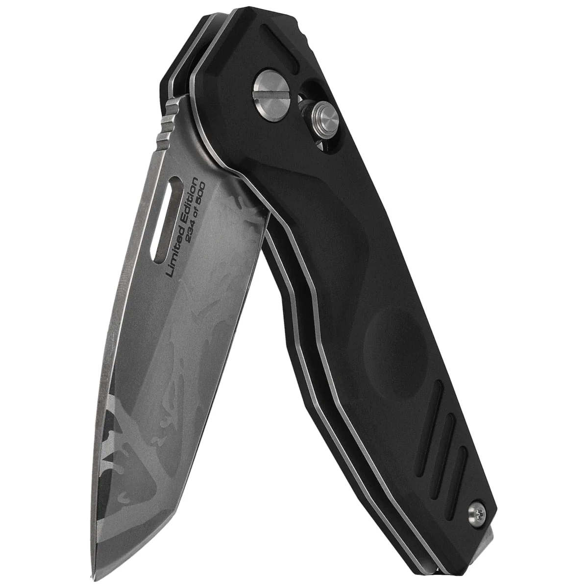 Blade made of Nitrogen steel, with a tanto profile with a reinforced tip, was finished with stonewashed technique with a laser camouflage pattern. This material combines corrosion resistance, high hardness and flexibility, making it an optimal choice for utility knives. The Axis Lock system provides secure operation and locking for heavy use, while the deep carry clip allows for low-profile carry. The anodized-coated aluminum grips are lightweight yet scratch- and impact-resistant. Paracord with a metal tip allows for personalization and easy grip.
