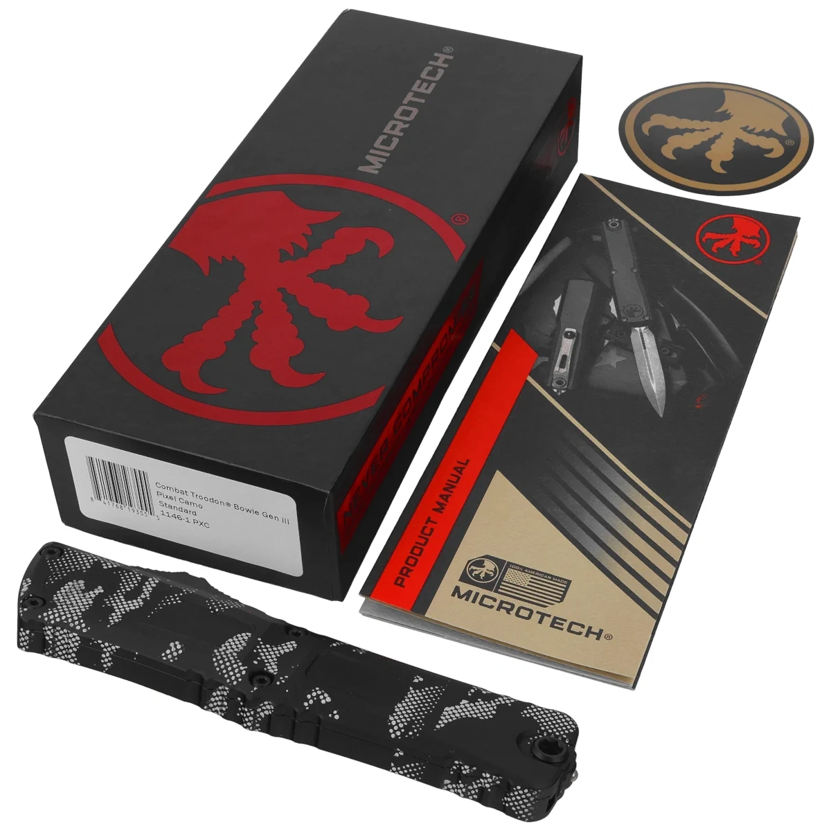 Combat Troodon Gen III Bowie Signature Pixel Camo Aluminum, Pixel Camo this largest of the automatic knives is the pinnacle of precision engineering and tactical prowess in the field of OTF (Out The Front) knives. Built for a wide range of utility applications, it boasts a 25% larger size compared to the flagship Troodon. Precisely crafted, it features a sophisticated and hellishly fast mechanism that extends the razor-sharp blade. 100% made and assembled in the USA. Designed by Anthony Marfione, knifemaker and owner of Microtech Knives.