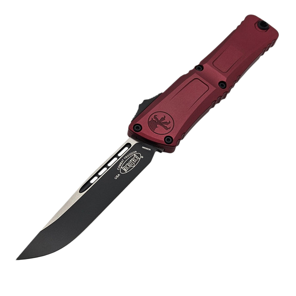 Combat Troodon Gen III S/E Merlot Aluminum, Black this largest of the automatic knives is the pinnacle of precision engineering and tactical prowess in the field of OTF (Out The Front) knives. Built for a wide range of utility applications, it boasts a 25% larger size compared to the flagship Troodon. Precisely crafted, it features a sophisticated and hellishly fast mechanism that extends the razor-sharp blade. 100% made and assembled in the USA. Designed by Anthony Marfione, knifemaker and owner of Microtech Knives.