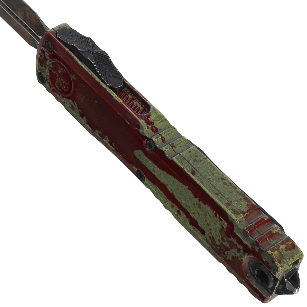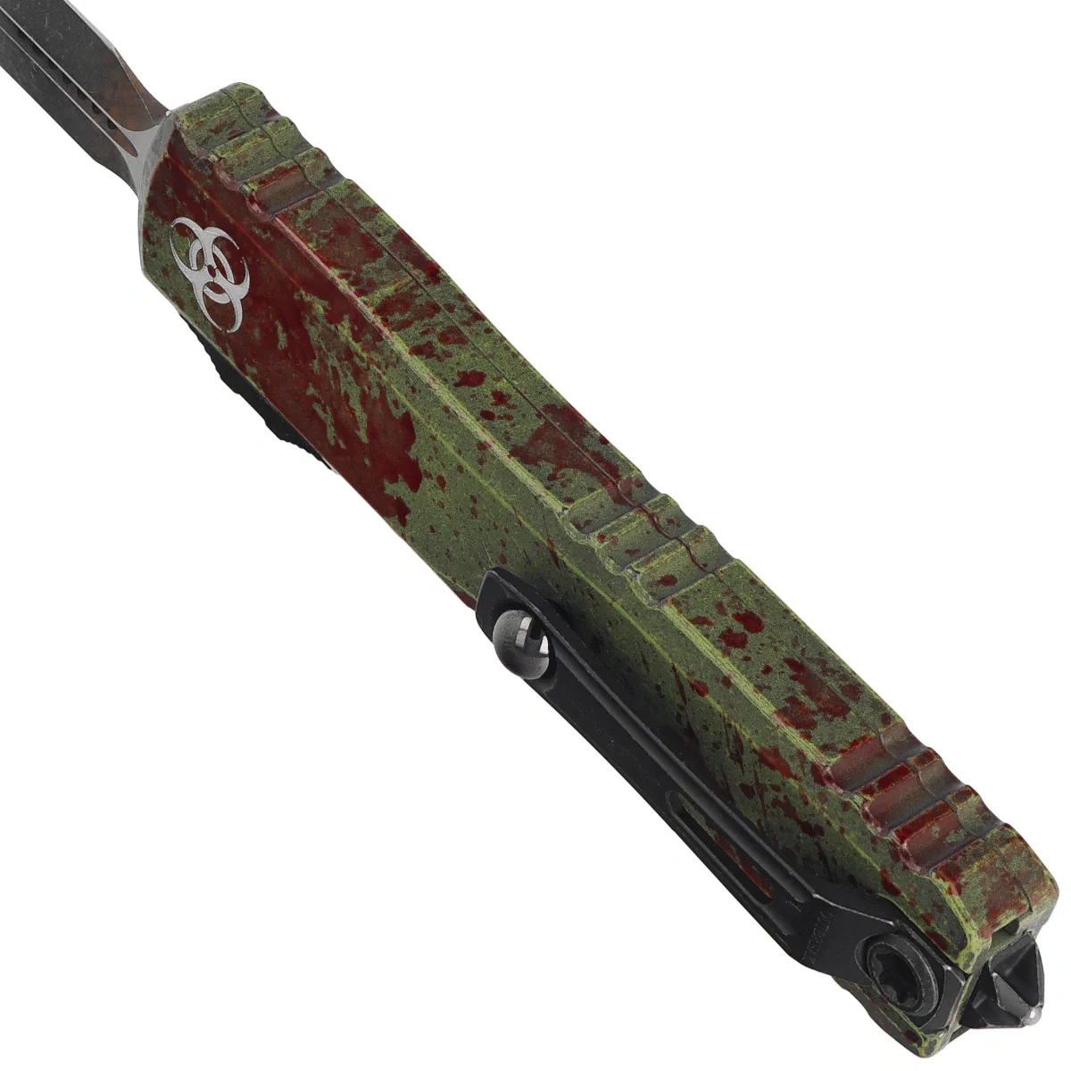 Ultratech D/E Gen III ZBP Signature Outbreak Aluminum, Outbreak is a new addition to the Ultratech series - Microtech's first OTF knife without any blade play when unfolded! The model is distinguished by a unique “Outbreak” finish in green with red splashes (“blood splatter”) and a deeply engraved Biohazard symbol , being the hallmark of the series. The blade play free automatic is distinguished by a number of improvements, such as; Crud Kutter™, Dual-Fuel Drive Train™, Zero Blade Play™. The Handle was also redesigned, equipping it with solutions known from other models. Working in D/A (Double Action) mode, it allows the blade to be instantly extended and retracted with a single thumb movement. The design by Tony Marfione, owner of Microtech Knives, combines modern design with the highest quality workmanship